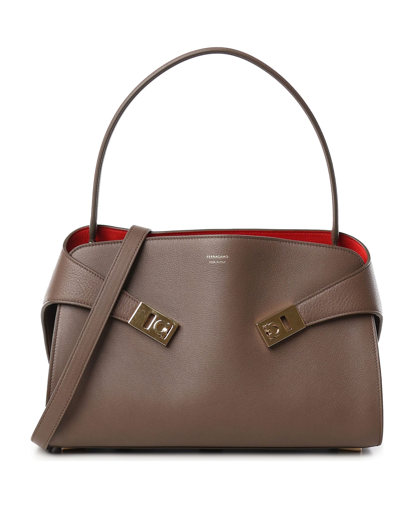 -Hug Soft shoulder bag -Wraparound shape of the Hug in a deconstructed version -Made of calf leather -Presents a single handle -Closed with an interior flap equipped with magnets and a practical T-bar that holds it in place -Measurements: 25. 5 x 34 x 15. 5 cm -Made in Italy -Color: Clay Composition: 100% Calfskin