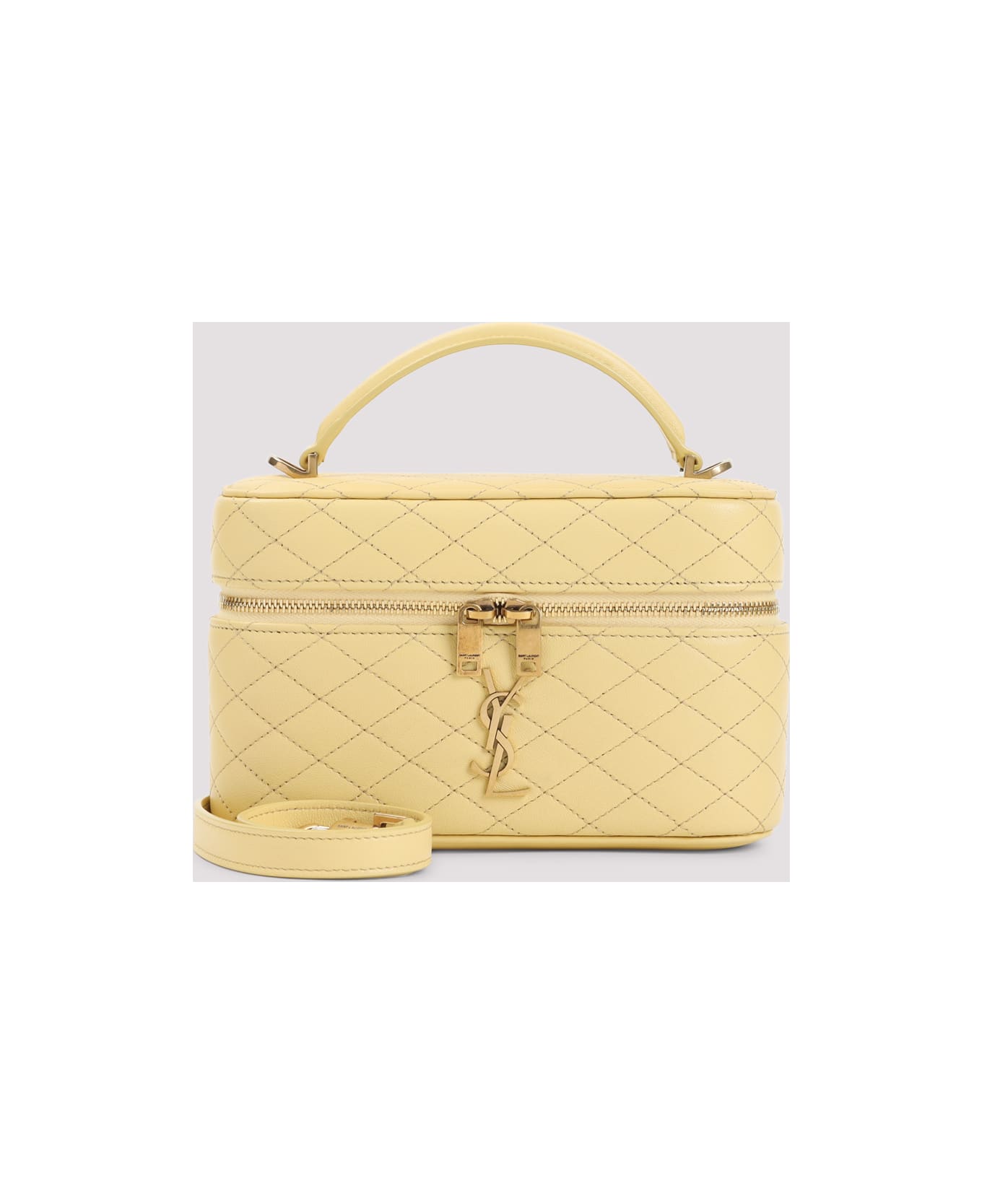 Saint Laurent Soft lemon Lambskin Vanity Gaby Mini Bag. Pure yellow lambskin bag, handle on top, front zipped fastening, front metallic YSL logo, tonal diamond quilted stitching, adjustable and removable shoulder strap, one main compartment. Bronze-tone hardware.