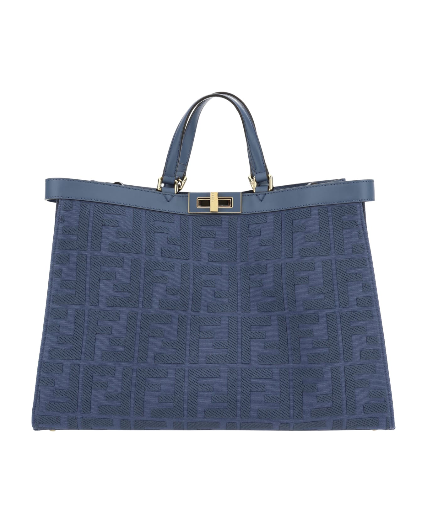 Cotton medium shopping bag by fendi, swivel front closure, double flat leather top handles, the brand's iconic ff logo embroidered in jacquard on the front, metal feet at the base for support, and an internal welt pocket.