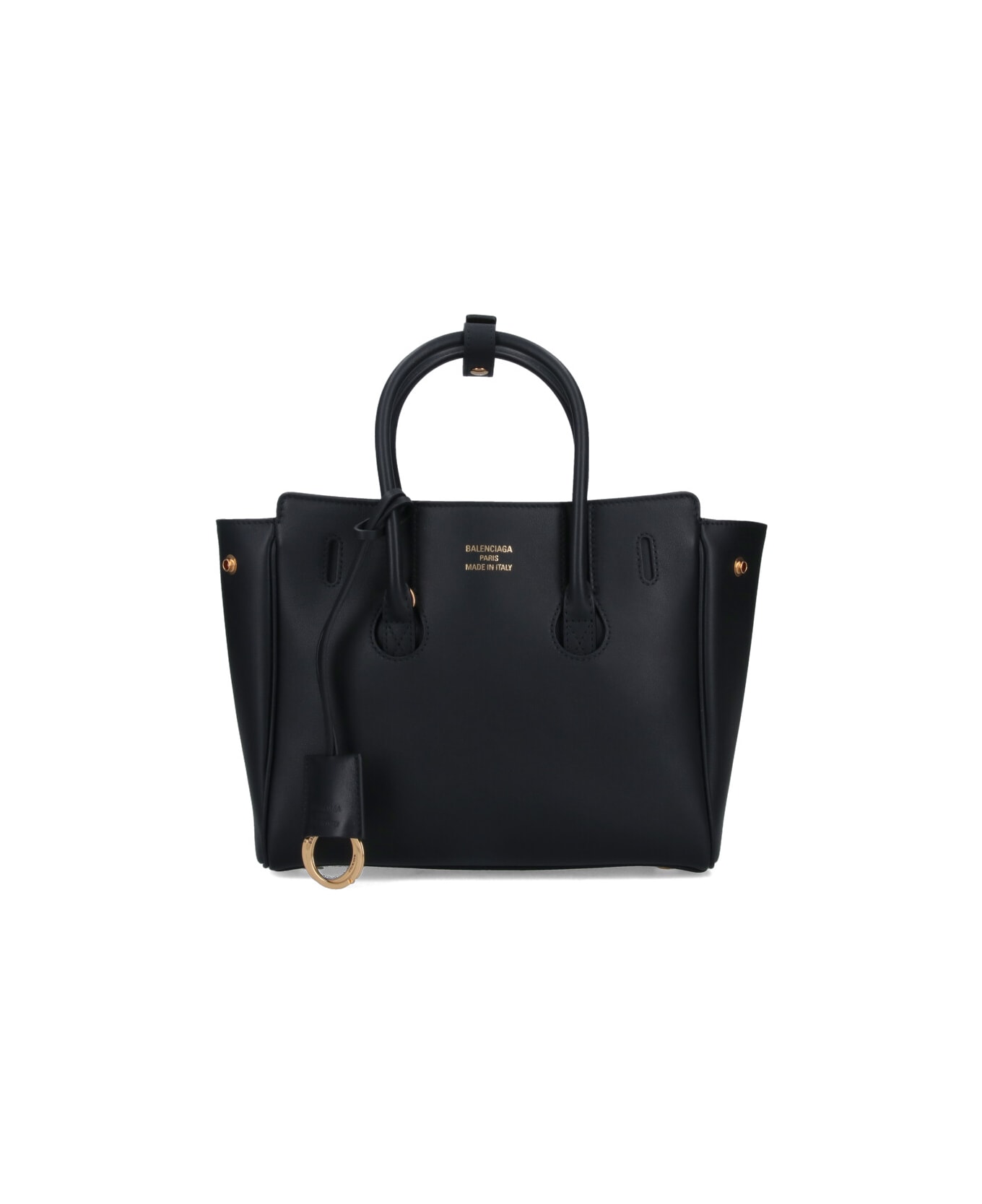 Balenciaga Hampton mini bag in black leather with two handles, removable double ring keyring detail in gold metal, adjustable and removable shoulder strap, magnetic closure, gold logo print on the front, side snap buttons, two inner flat pockets, one maxi inner zip pocket, one main inner compartment, metal feet on the bottom.