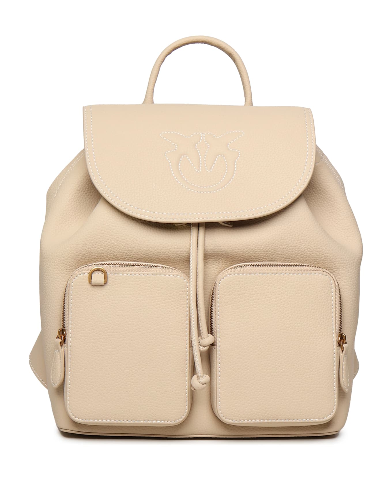-Small backpack in soft leather -Love Birds logo in relief -Adjustable drawstring closure -Top handle -Adjustable shoulder straps -Front pockets with zip closure -Interior of the backpack lined in fabric and also includes a wall pocket with zip -Measurements: 33 x 25 x 15 cm -Color: Beige