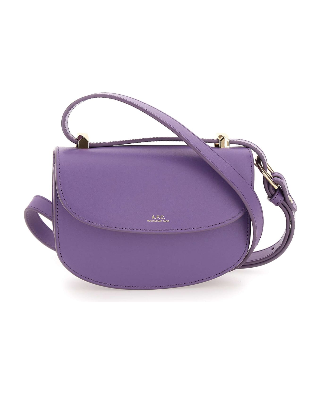 Shoulder bag A. P. C. "Geneve" embossed leather, violet color, fastening with flap and magnetic button, adjustable and removable shoulder strap, brass metal finishes, an internal compartment, an inner pocket, cotton lining in the same color. Dimensions: length 19cm, height 14cm, depth 6cm. Shoulder length 53 cm. Fabric case included.