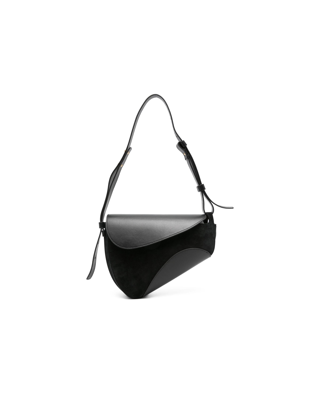 black leather suede panelling adjustable strap curved silhouette flap closure