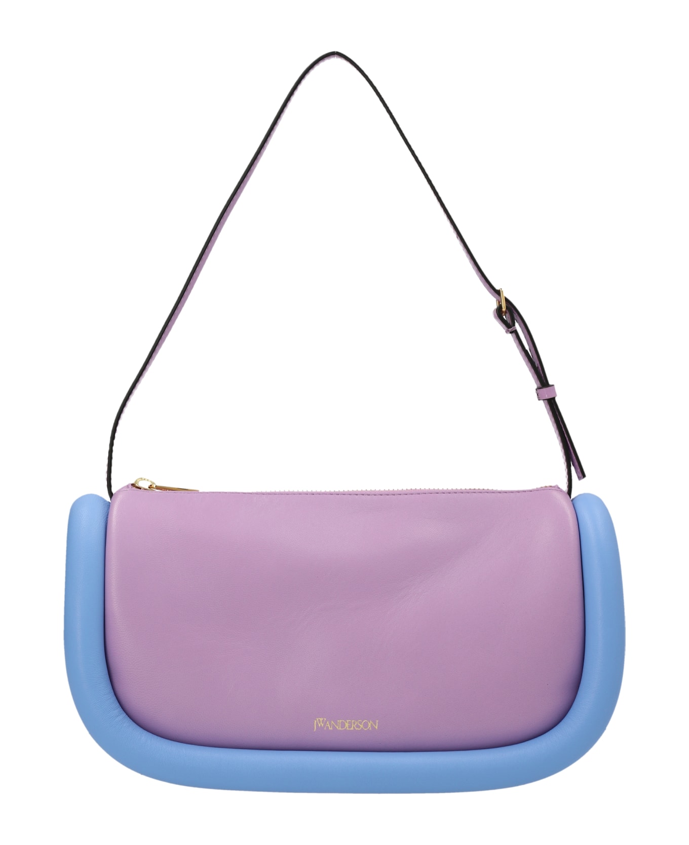 Bumper 15' two-color leather shoulder bag with adjustable leather shoulder strap, tubular padding, gold color embossed logo, zipper closure, inner pocket, nappa lining, gold metal components.