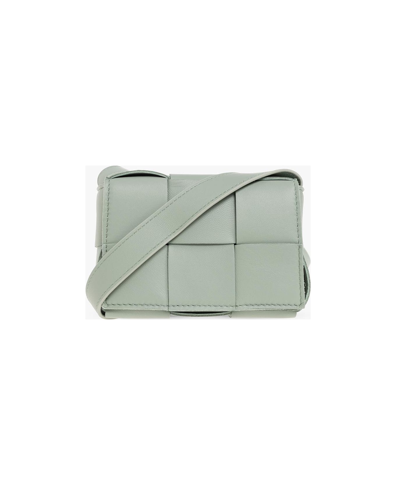 Greyish green 'Candy Cassette Mini' shoulder bag from Bottega Veneta. Crafted from lamb leather with the brand's signature 'Intreccio' weave, this design features a flap with a magnetic snap, an adjustable shoulder strap, gold-tone metal hardware and one