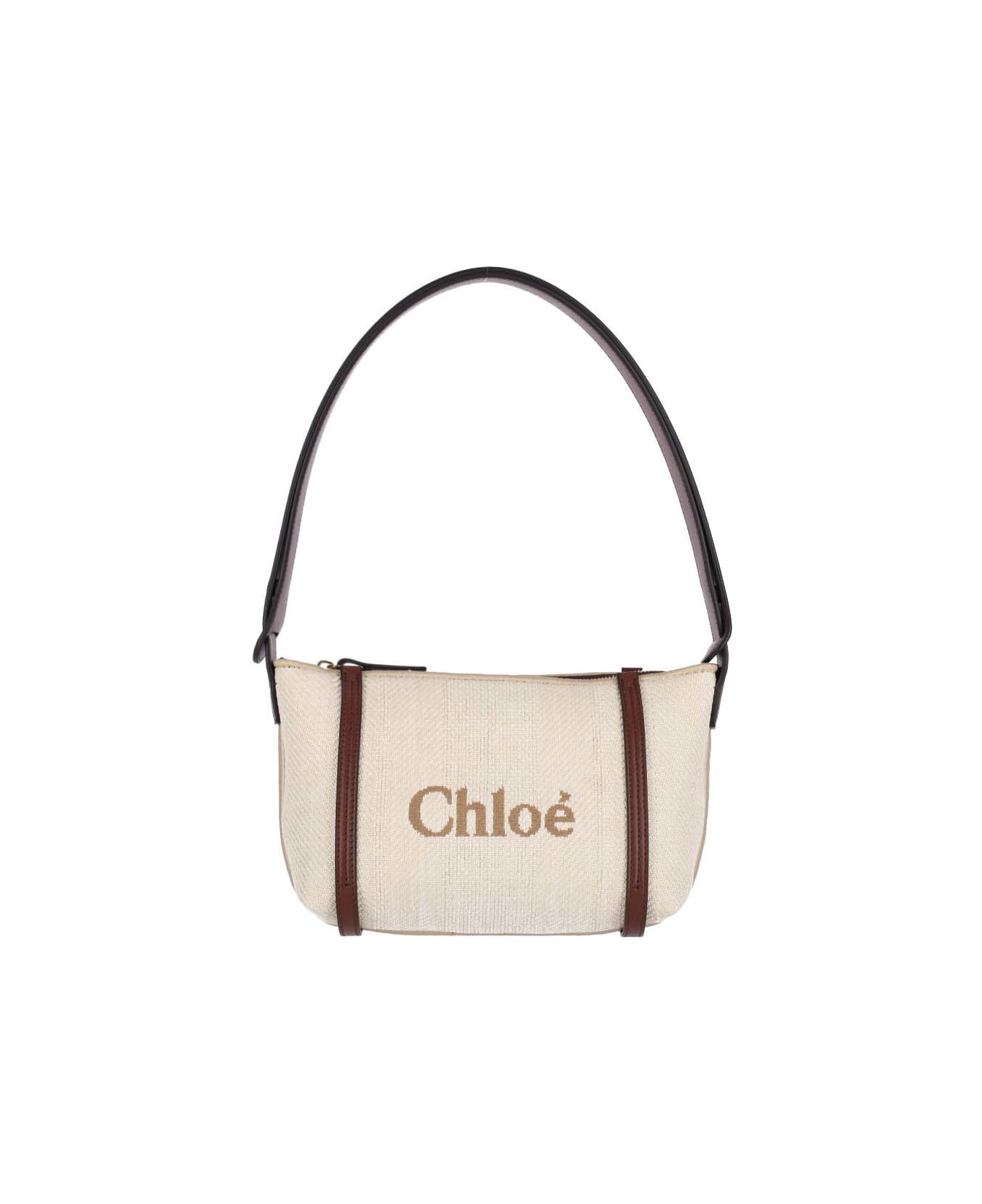 Chloé Carry shoulder bag in cream cotton blend with calf leather trim, adjustable handle, zip closure, logo embroidery on the front and back, inner flat pocket, and single inner compartment. Composition: 69% Cotton, 31% Polyamide
