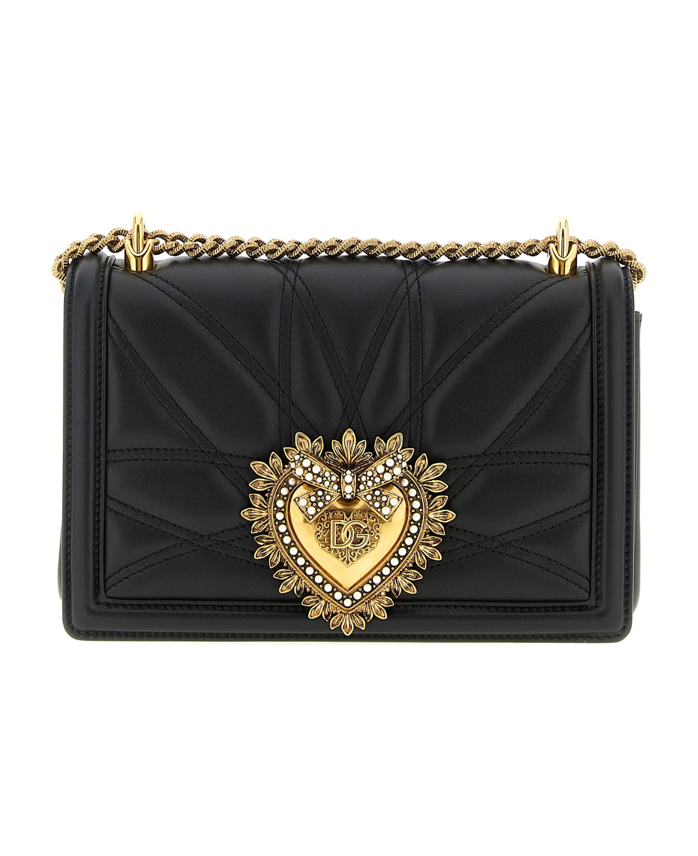 'Devotion' shoulder bag in matelassé nappa leather with embroidered cord, snap flap closure with sacred jewel heart handmade in metal alloy with front pearl inlays, sliding chain shoulder strap with leather shoulder protection. Composition: 100% leather