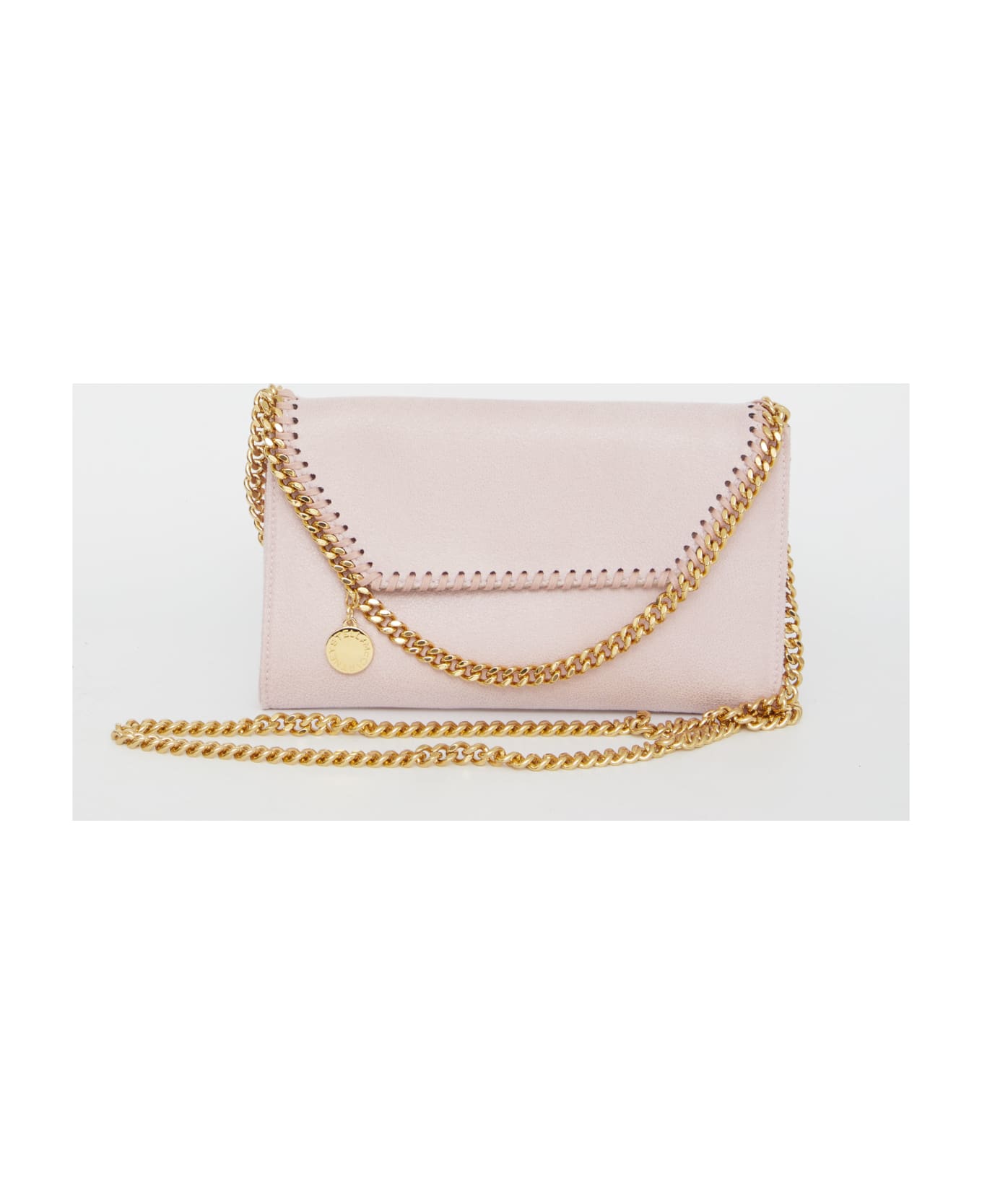 Falabella mini bag in pink suede-effect vegan fabric with gold-tone diamond-cut chain. It features adjustable shoulder strap with Stella McCartney charm, front flap with snap-button closure, one main interior compartment and one interior slip pocket. Dimensions: 14x22x4cm