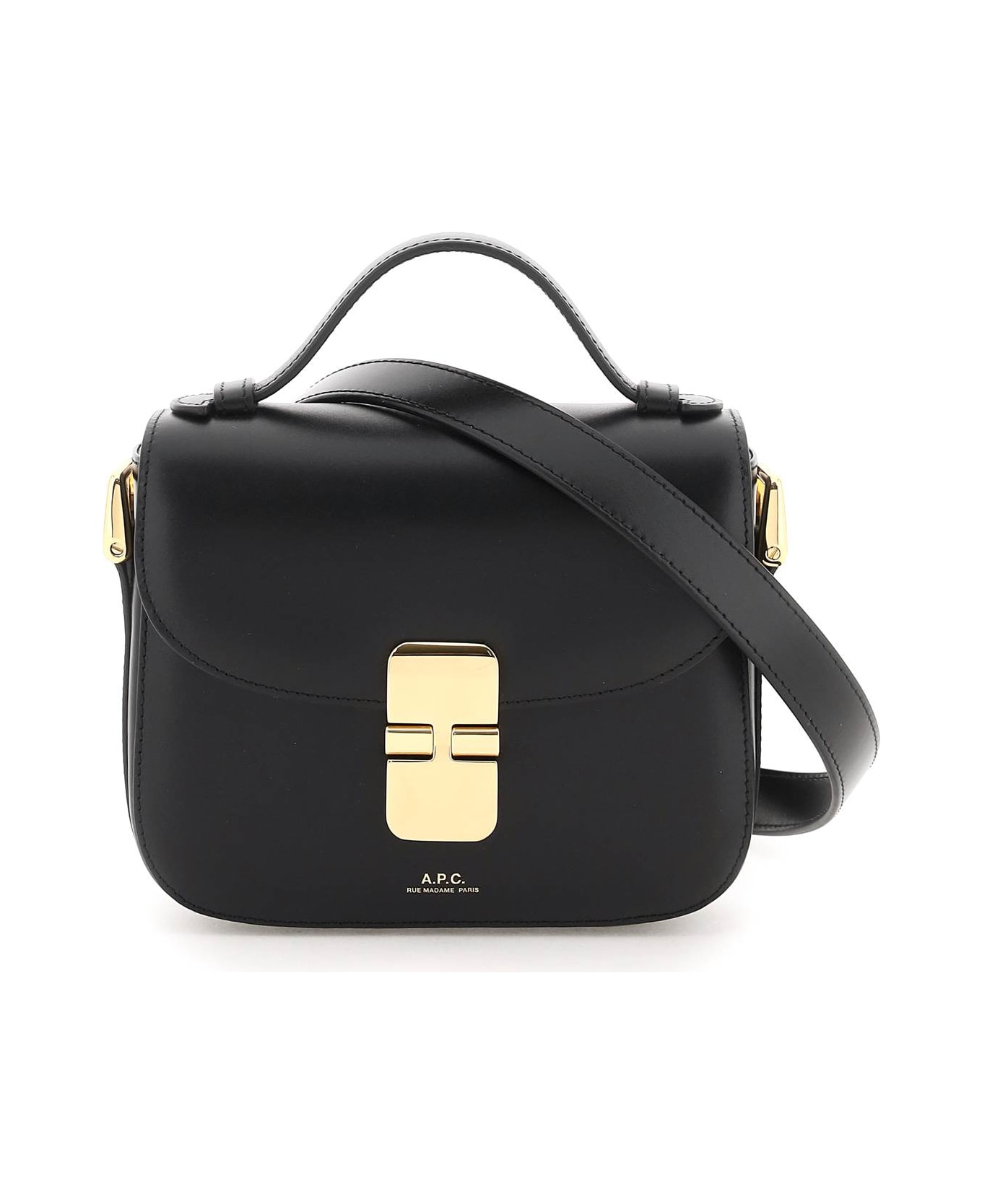 A. P. C. Grace Mini bag in smooth leather featuring flap with metal joint closure, gold-tone logo print on front, top handle and adjustable, detachable shoulder strap. Cotton lining, two flat compartment and a middle gusseted compartment. Gold-finished metalware.