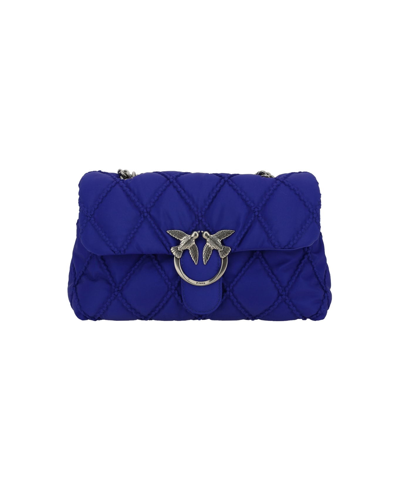 Blue royal Love Classic Puff Shoulder Bag from Pinko Love classic puff shoulder bag by pinko, front closure with magnetic button, iconic gold-plated and embossed love birds logo on the front, padded and quilted design with all-over matching stitching, double interior compartment, sliding chain shoulder strap with adjustable leather part, interior slit pocket.