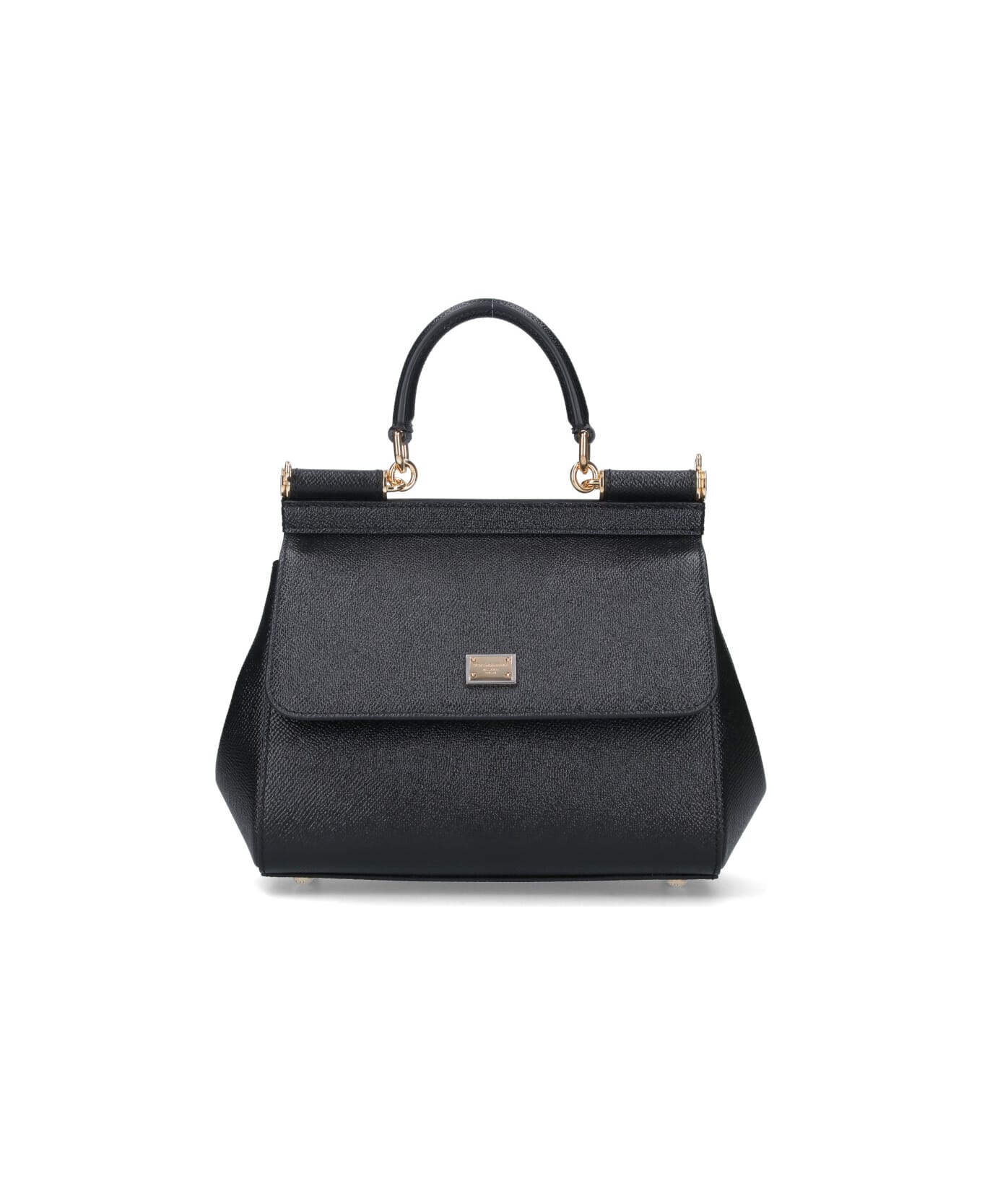 Dolce & Gabbana 'Sicily' medium handbag in black calf leather with handle, adjustable and removable shoulder strap, magnetic flap closure, gold metal logo tag detail, inner flat pocket, inner zip pocket, main inner compartment. Composition: 100% Calf Leather