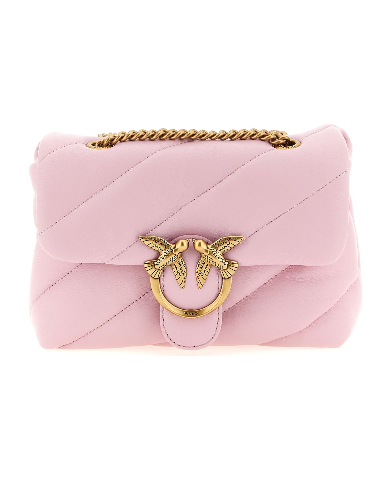 'Mini Love Puff' nappa crossbody bag with maxi oblique quilting, magnetic flap closure with iconic 'Love Birds Diamond Cut' metal buckle, suede microfiber lining, sliding chain shoulder strap with nappa shoulder strap.
