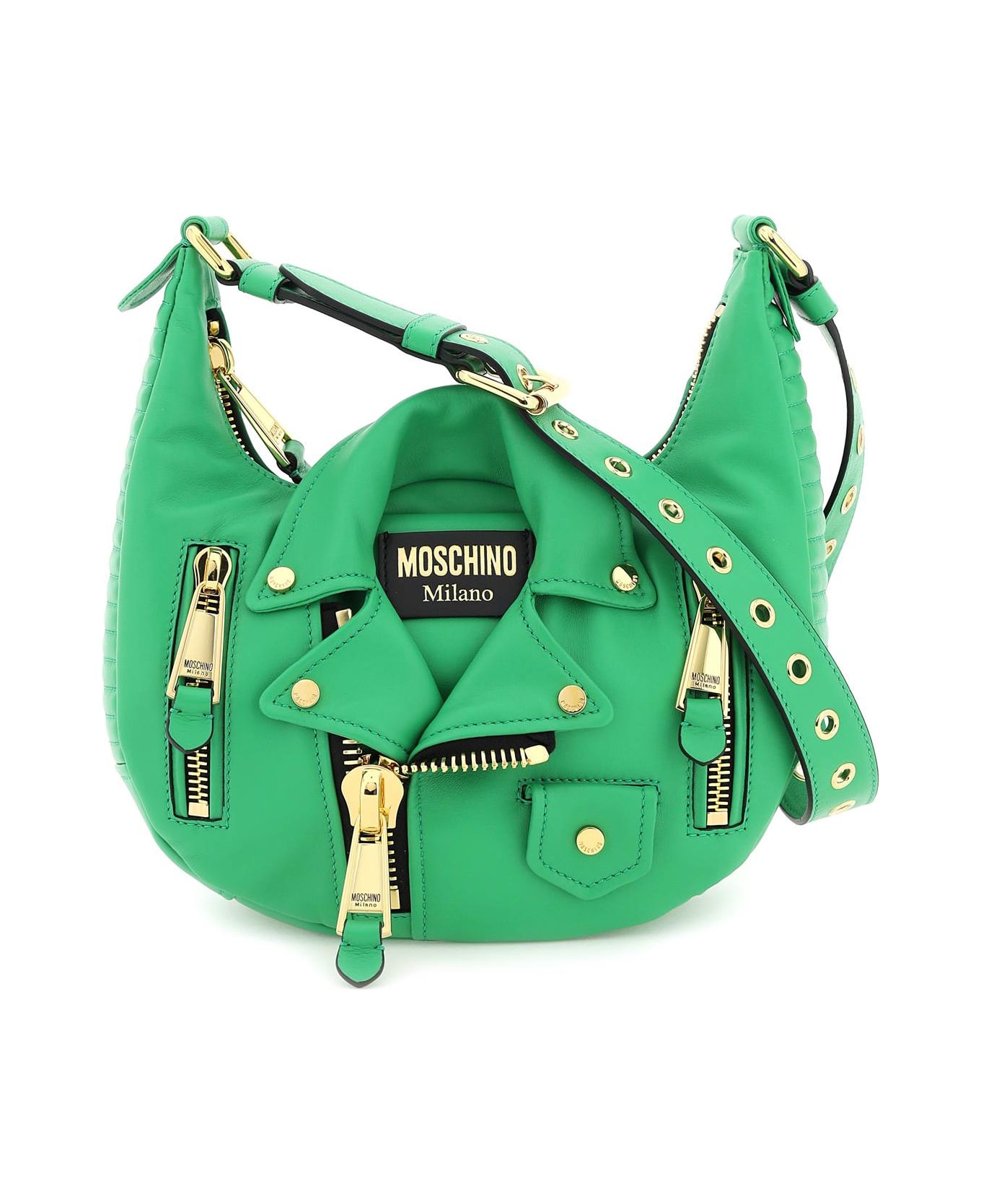 Biker shoulder bag by Moschino in soft nappa leather, characterized by zip and details which reproduce a biker jacket. Leather tag with gold-tone logo print applied on front, adjustable handle with metal eyelets on the full length, zip closure, fabric-lined interior with a zipped flat pocket and a leather patch card pocket. Gold-finished metalware, Composition: 100% leather