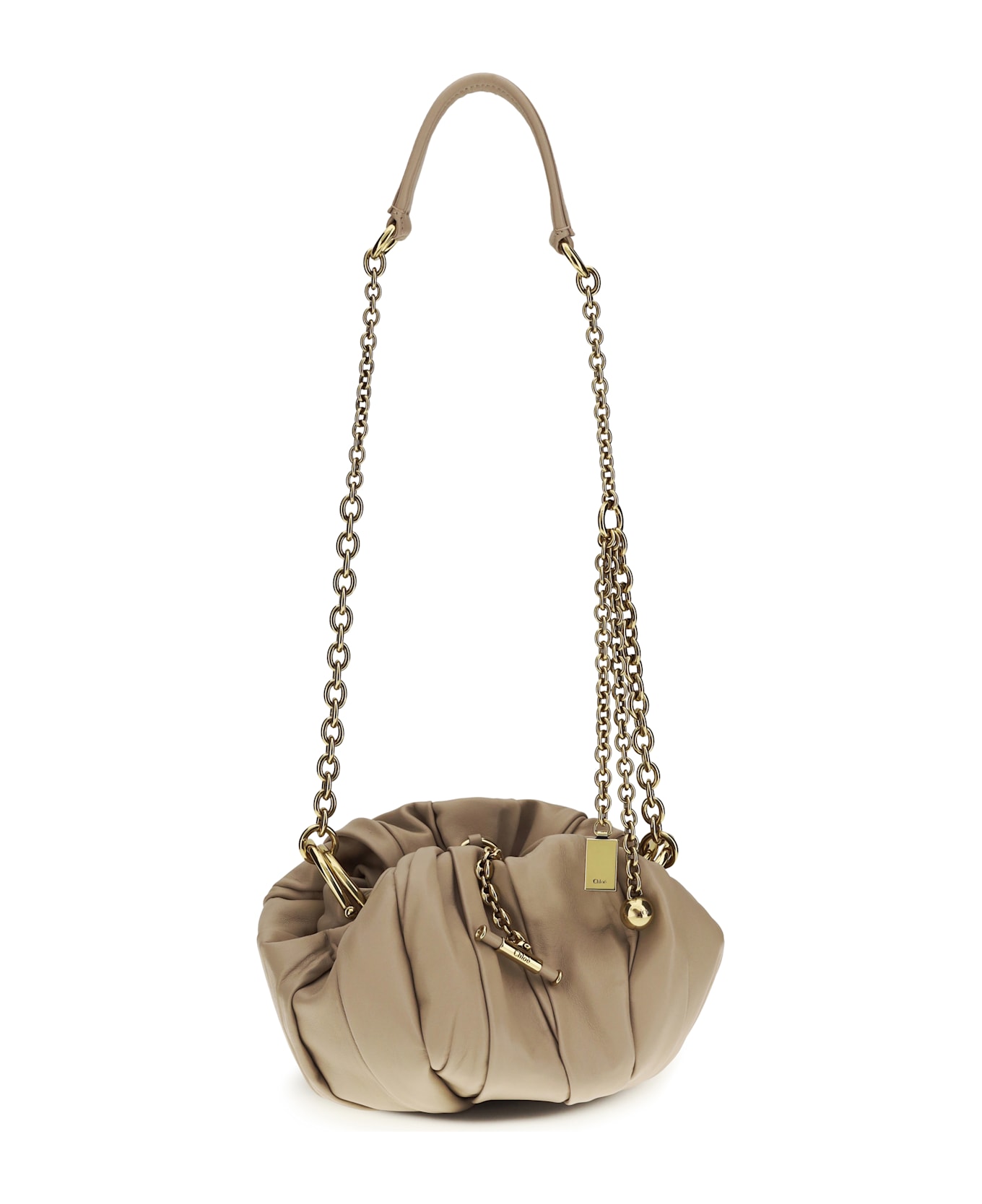 The plissé shoulder bag by chloé, crafted from pleated lambskin leather, combines elegance with refined design. the rounded silhouette, featuring a toggle closure, is complemented by a leather shoulder strap with a chain, embellished with dangling charms and links of varying sizes. the iconic horse medallion adorns the base of the bag, making it a distinctive and sophisticated accessory, perfect for enhancing any look with a touch of contemporary luxury.
