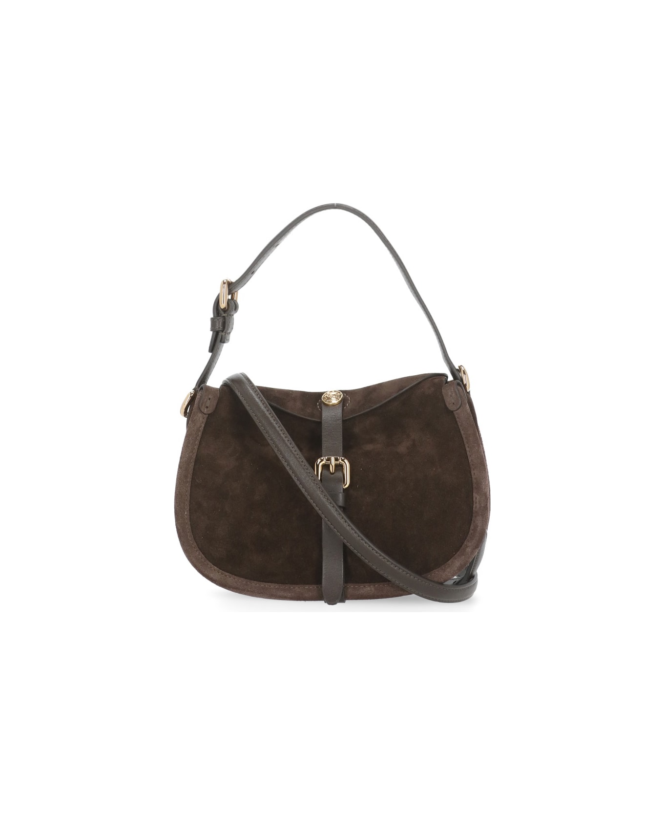 - Brown Etro suede leather shoulder bag - Front belt and magnetic button fastening - One adjustable and removable shoulder strap - One removable handle Composition: 100% Calfskin