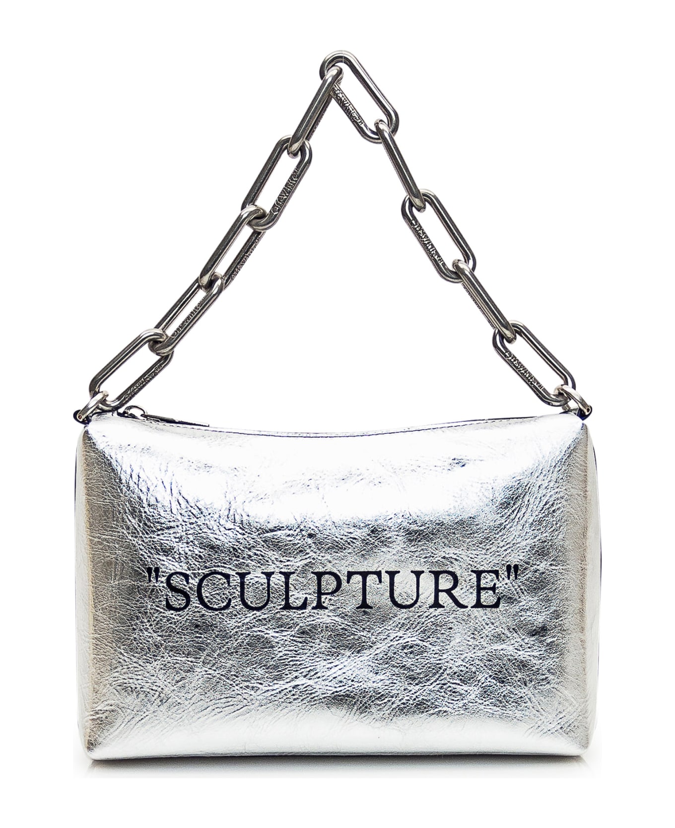 Silver leather shoulder bag. A chain handle with engraved logo. Inside zip pocket. Zip closure. Lettering on the front. Logo on the back.