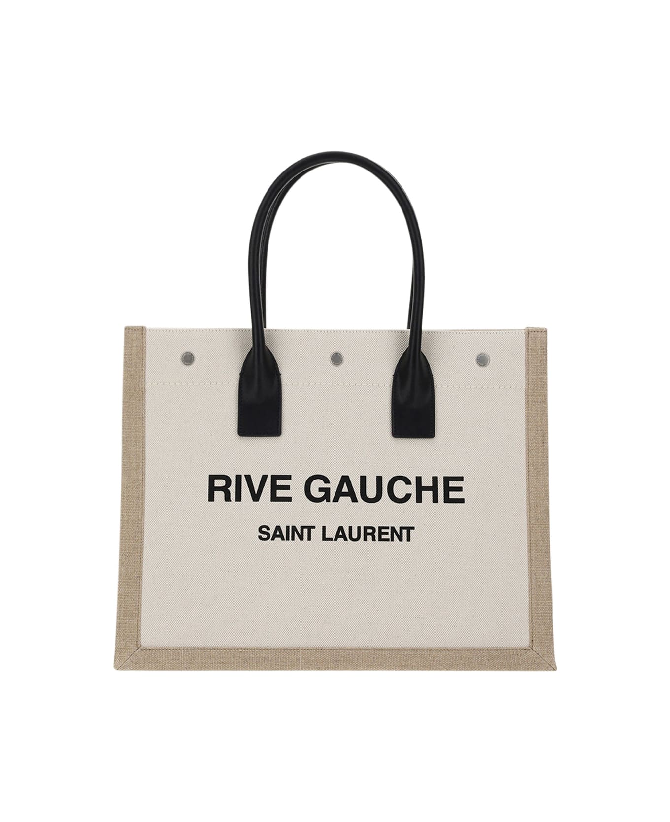 Linen and cotton rive gauche tote bag by saint laurent, contrasting leather double handle, iconic brand monogram printed in contrast on the front, three snap button closure, interior welt pocket with zipper. Composition: 50% % Cotton, 50% % Cotton