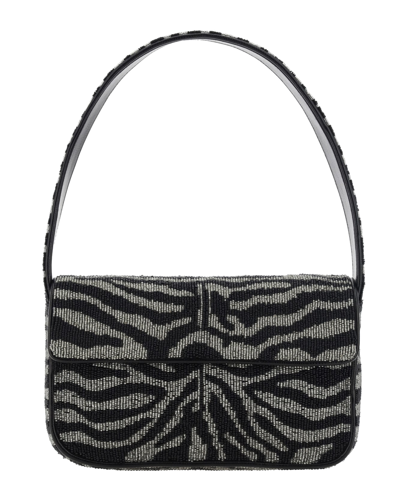 Tommy beaded shoulder bag by staud, design embellished with all-over beaded applique, flat top handle, front closure by magnetic flap, iconic contrasting brand logo on back, single inside pocket.