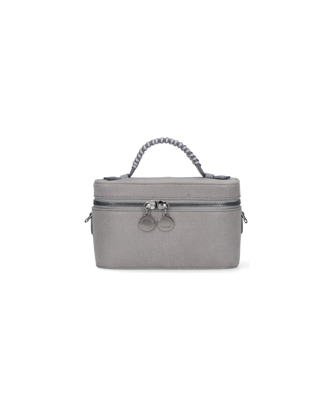 Vanity bag "Falabella" by Stella McCartney in gray fabric, featuring a top handle, double zip closure, chain shoulder strap, one flat internal pocket, and one main internal compartment. Composition: 100% Polyester