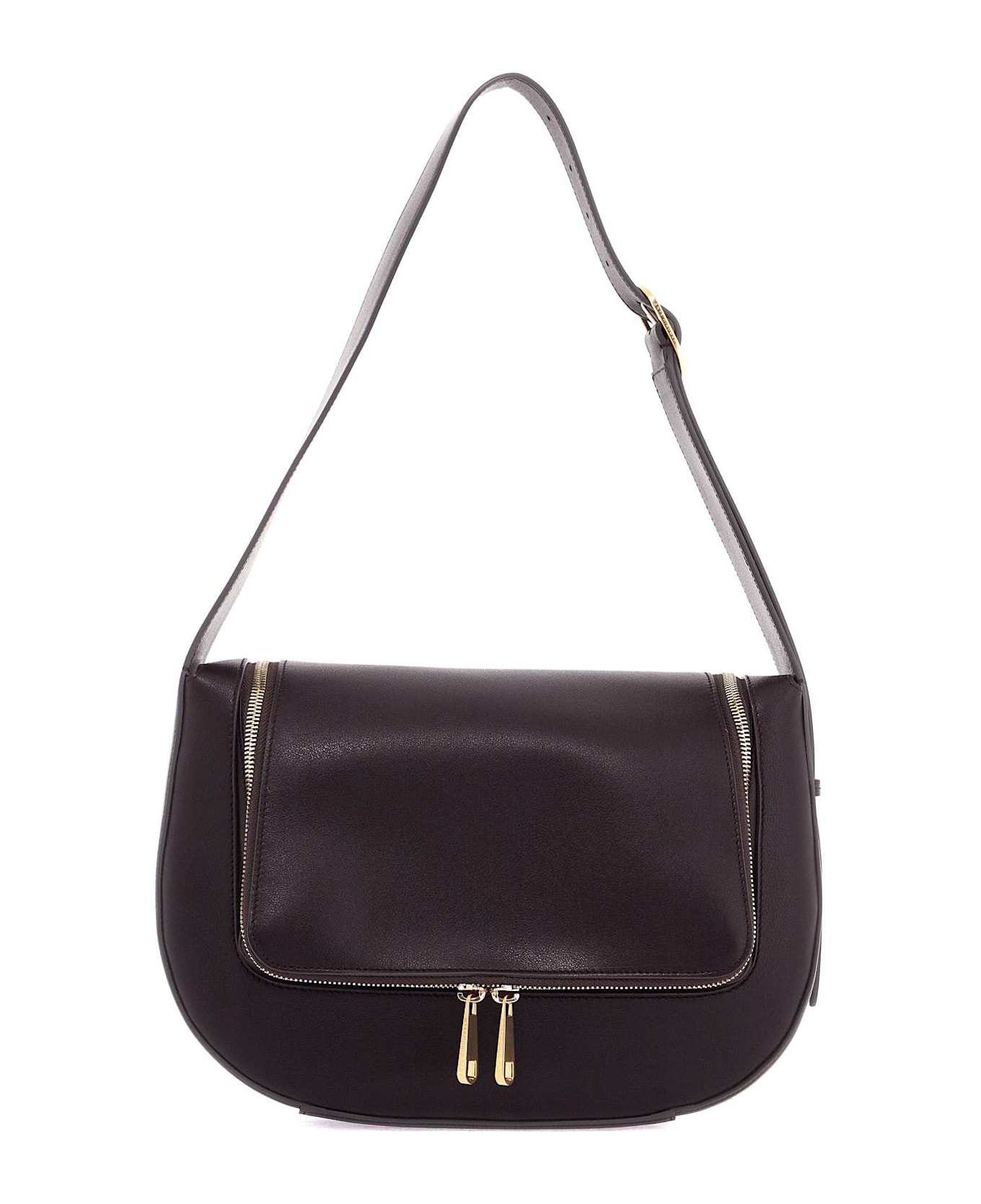 The Anya Hindmarch Vere shoulder bag is made of finely grained leather with a two-way zip closure. The interior is lined with smooth and suede leather, featuring several functional pockets and an additional slip pocket on the back. The handle can be adjusted using the gold metal buckle.