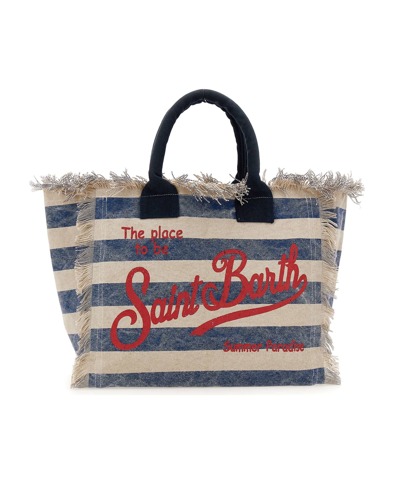 Mc2 Saint Barth "Vanity Summer Paradise" cotton canvas handbag, blue striped pattern on an ecru background, double top handle, fringe detail, top zip fastening, single internal compartment,internal zip pocket, slip pocket with logo, cotton lining,maxi red logo print on front and back. Dimensions: length 40cm, depth 20cm, height 32cm.