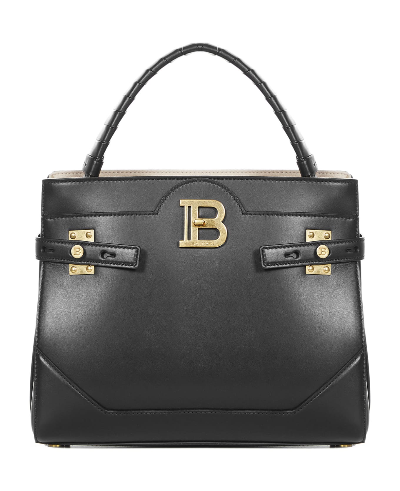 • Golden-metal B quarter-turn clasp at front; Front buttoning with adjustable straps decorated with logoed rivets