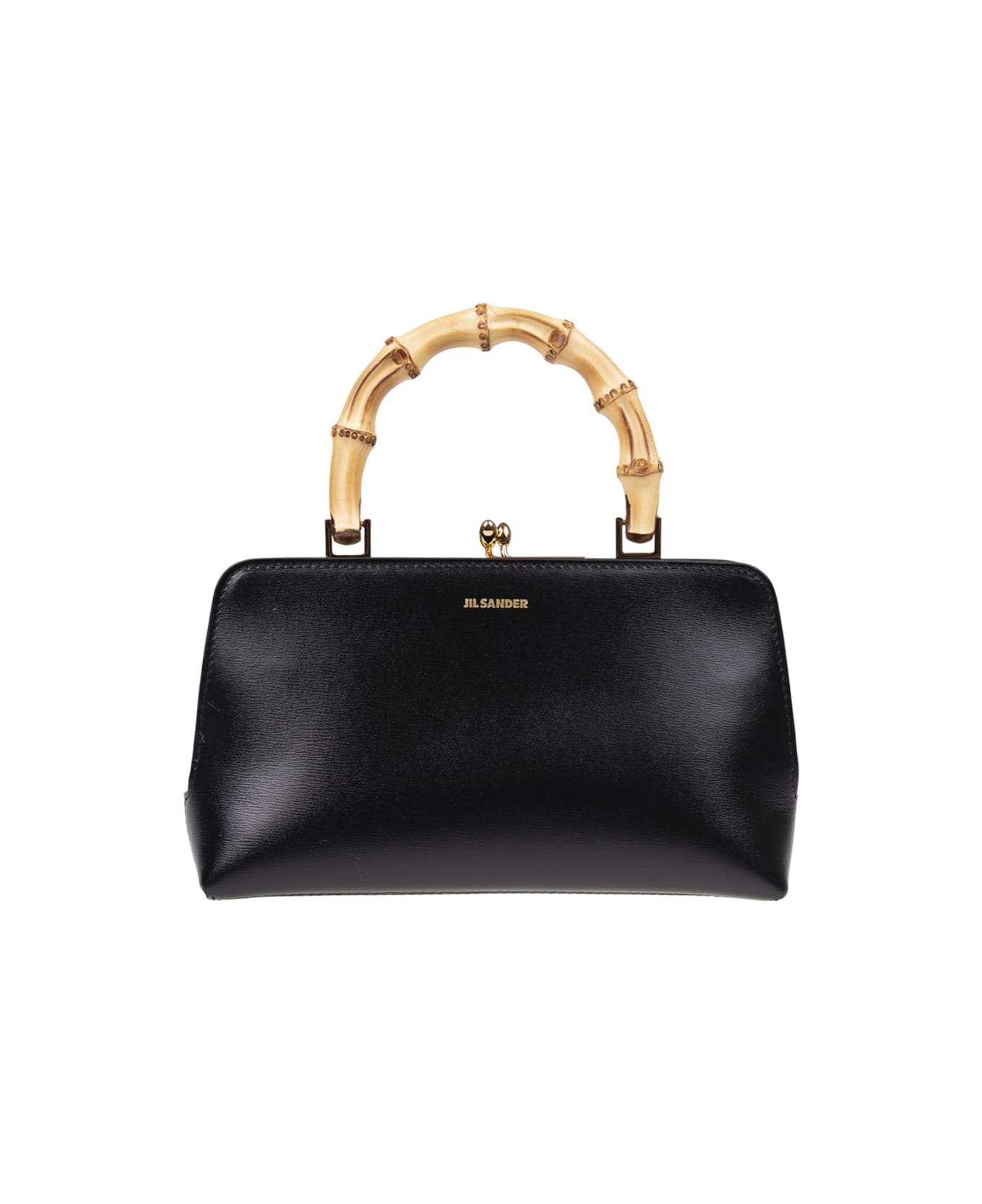 Goji Bamboo mini bag from Jil Sander crafted from black calf leather with metal frame detail and embossed aluminium Jil Sander logo to the front. Featuring a nappa leather lining, an internal zipped pocket, a single internal compartment, a bamboo handle with an enamelled finish and a clutch closure with goji berry detailing.