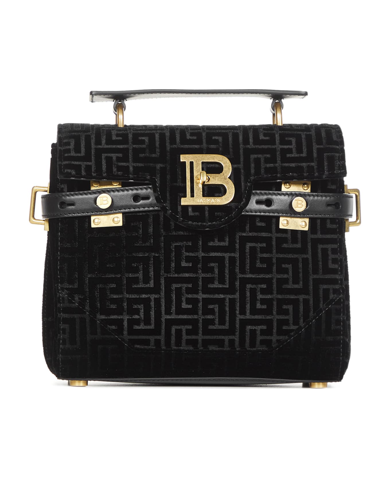 Quarter-turn "B" closure in golden metal; Front buttoning with adjustable straps decorated with designer rivets