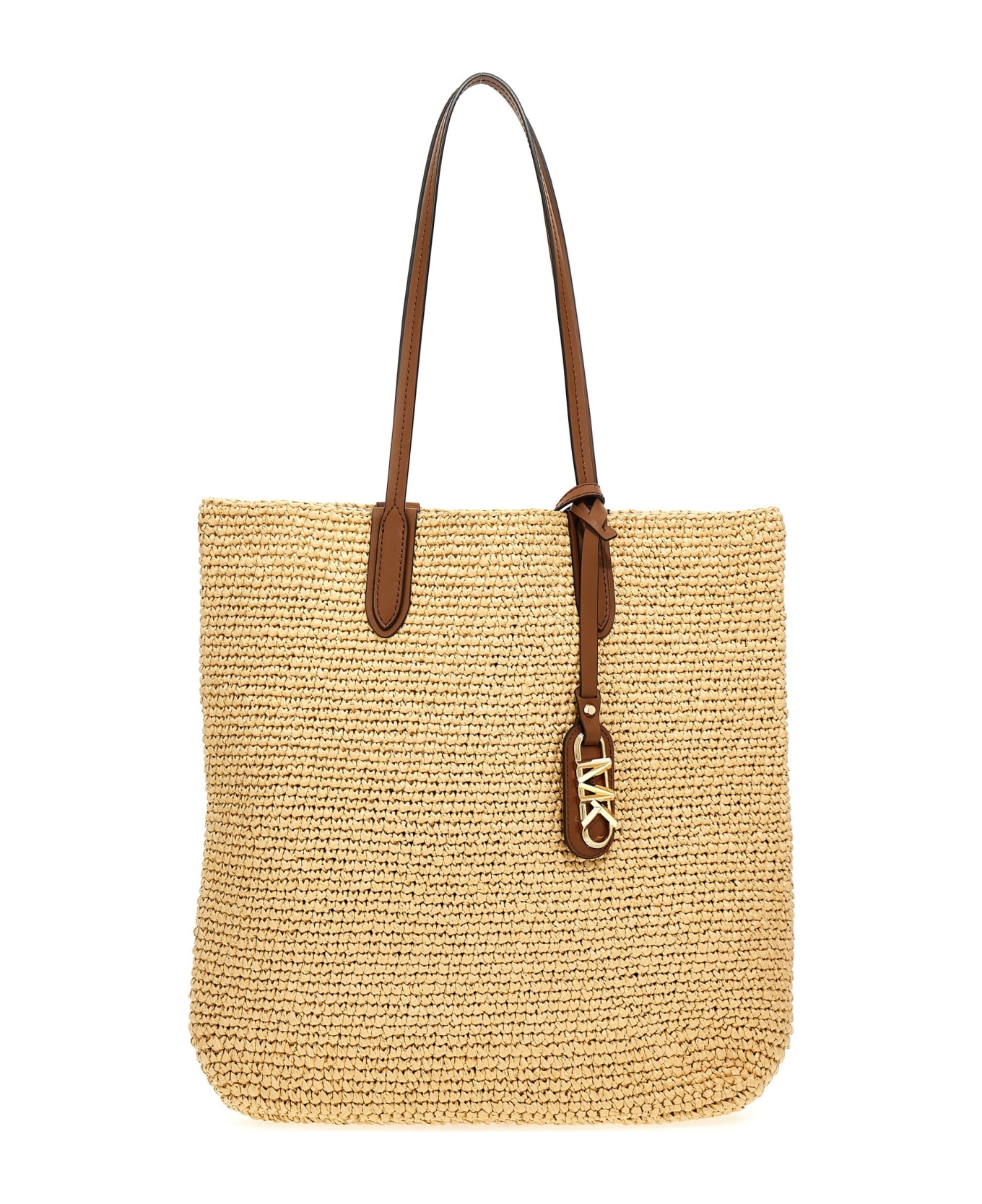 Eliza' straw shopping bag with double leather handle, a leather and metal logo tag.