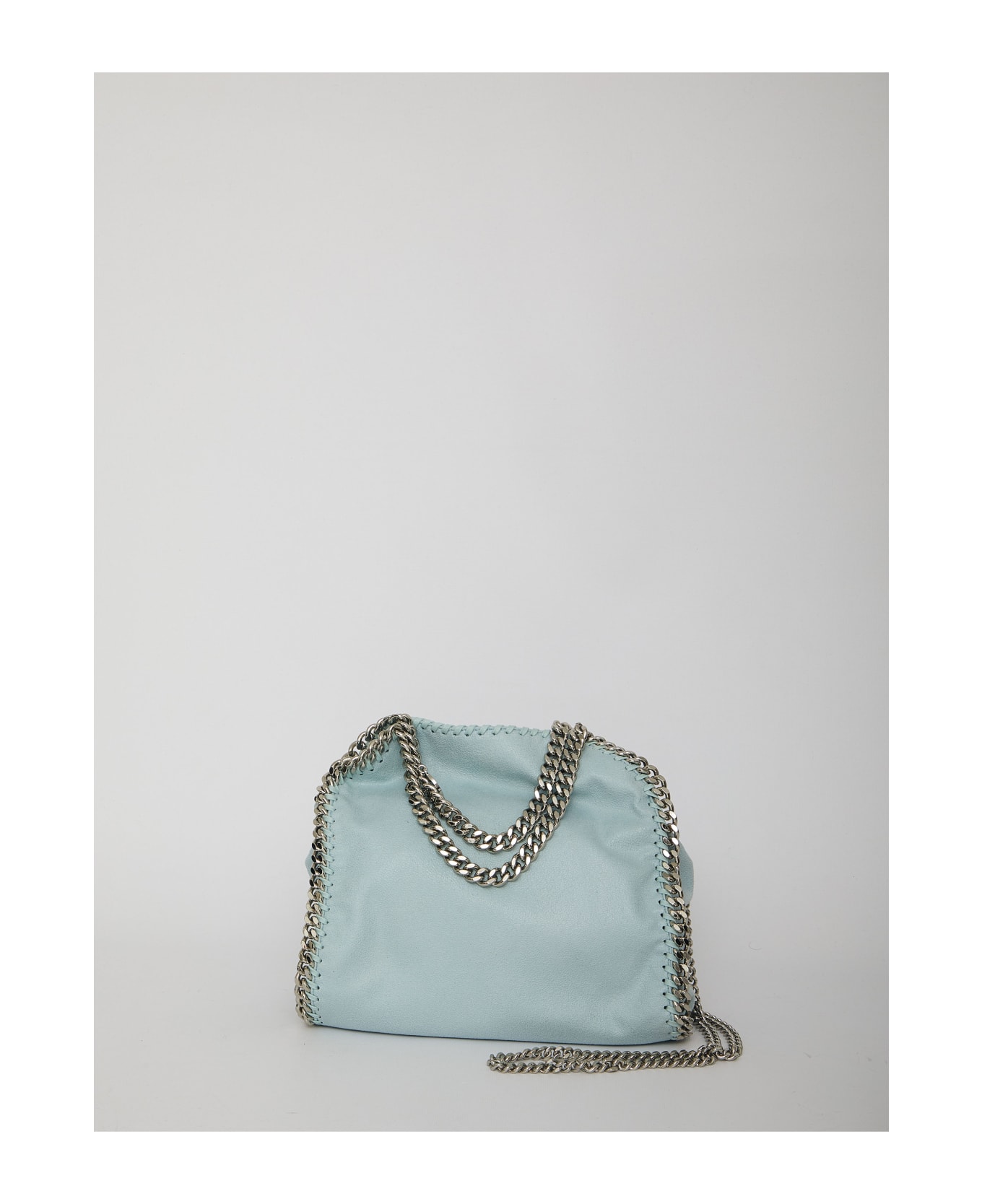 Falabella Mini tote bag in light-blue grained vegan Shaggy Deer fabric with silver diamond-cut chain. It features chain double handles, chain shoulder strap, snap button fastening, one main interior compartment and one interior slip pocket.