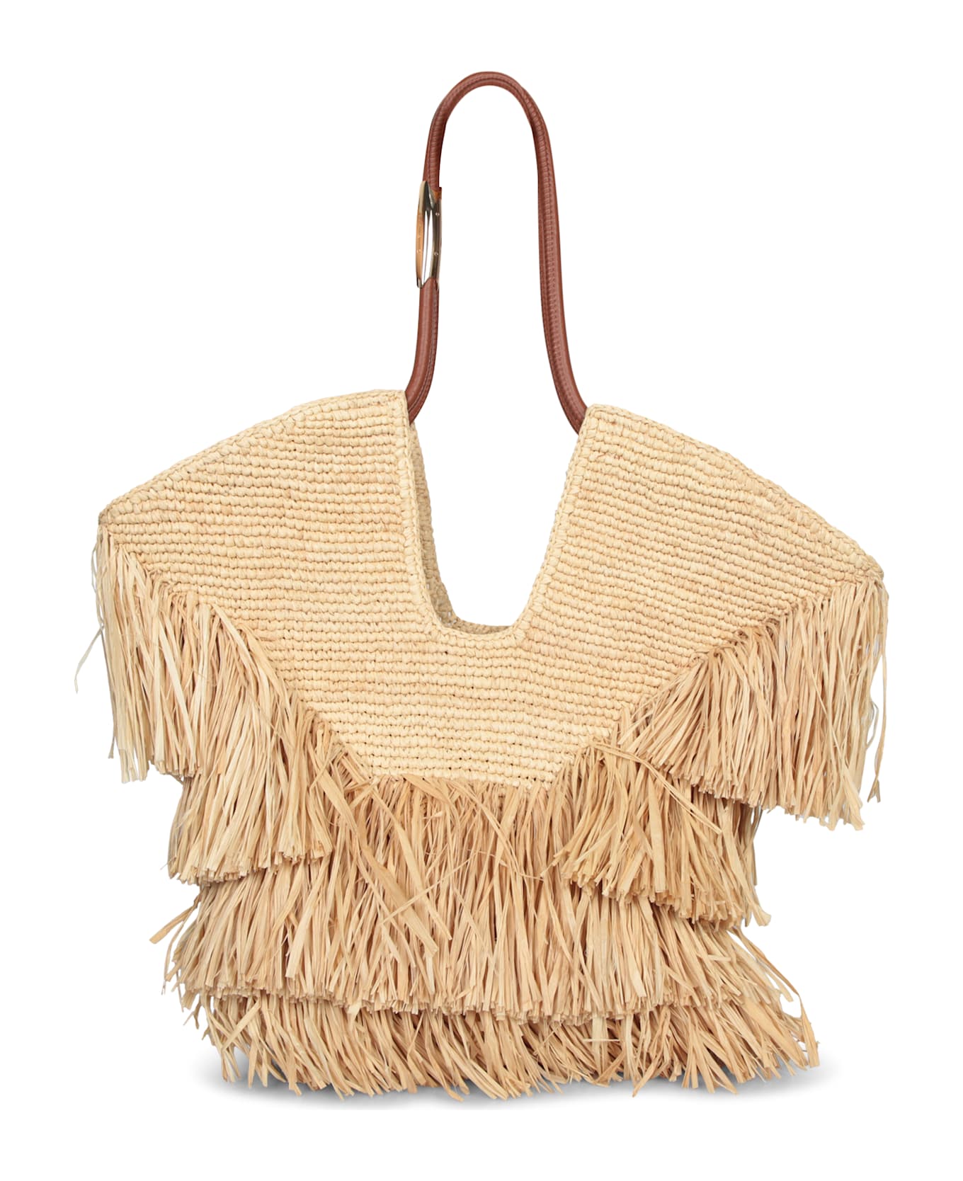 Designed for everyday elegance, this Zimmermann bag features a unique design with artisanal weaving enhanced by layers of fringes. The brown leather handles match perfectly, providing a touch of sophistication.
