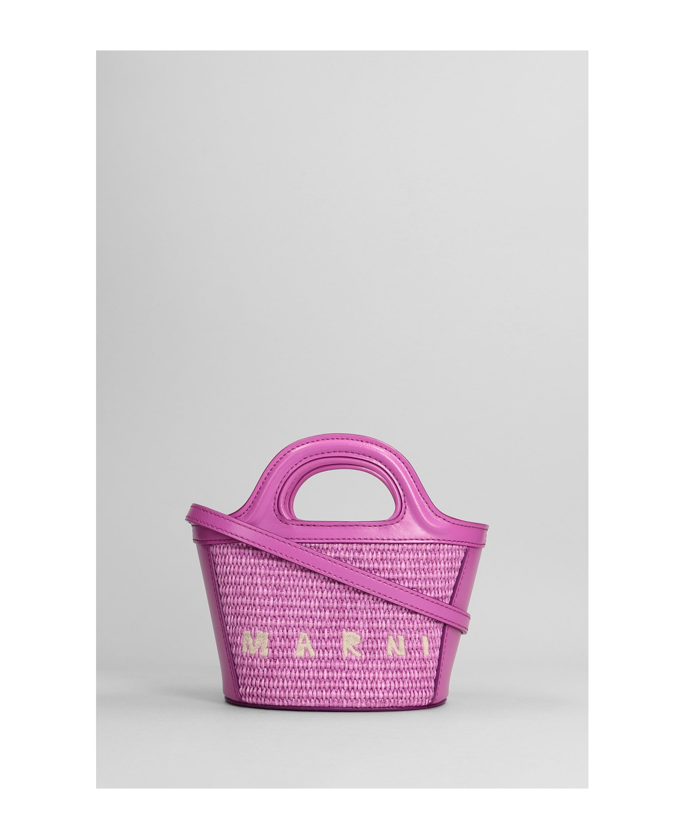 Hand bag in Viola Silver, double handle, shoulder strap, leather insert detail, front logo, Made in Italy, 100% rafia, Height 125 mm, Width 195 mm
