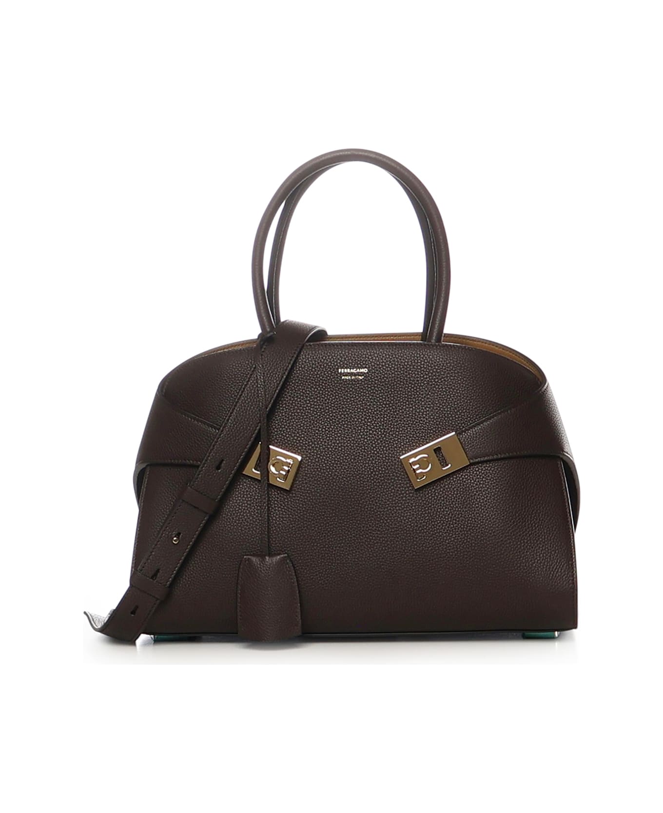 -Made of calfskin -Ring closure -Two handles -Lined zip pocket -Leather shoulder strap -Includes removable key ring charm -Made in Italy -Dimensions: 31. 5 x 22 x 19 cm -Color: Brown