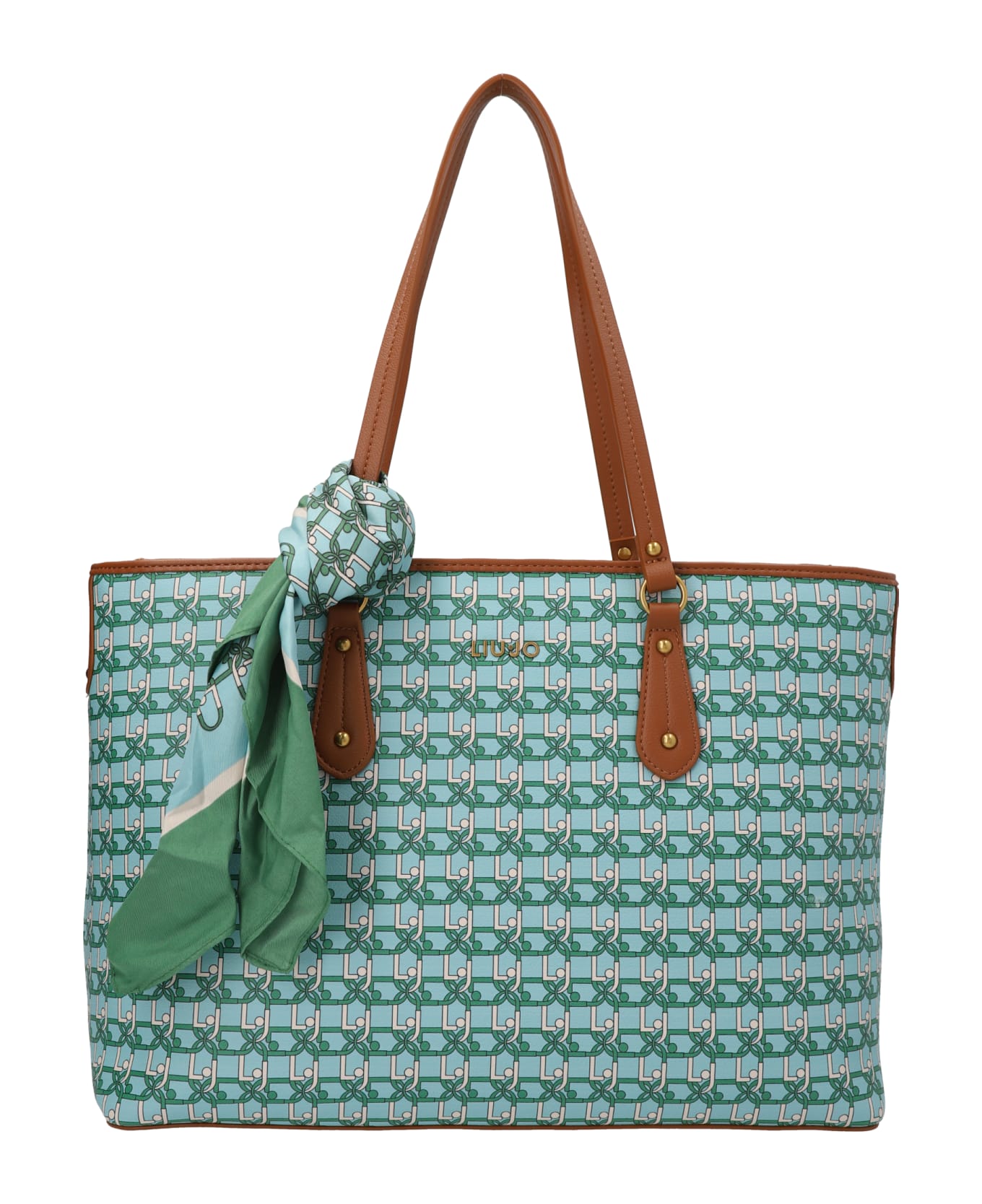 'L' in polyurethane shopping bag with all-over chain logo print, front metal logo, a matching scarf, double handle, contrast lining, an inner logo label and a zip closure.