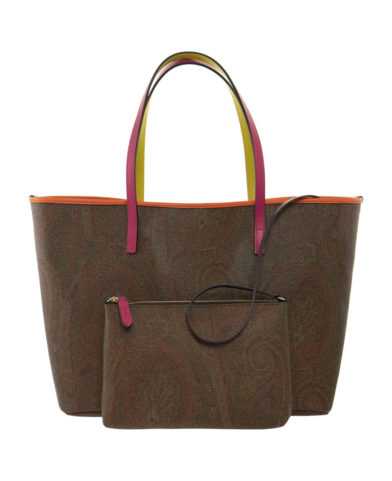 Tote bag in Etro's iconic Paisley jacquard fabric. Featuring multicolored leather detailing, it contains a removable pouch in the same jacquard pattern. Exterior: Paisley cotton jacquard coated fabric with matt grain and canvas lined. - Internal zip pocket - Snap hook closure - Removable pouch - Gold tone metal hardware - Lined in ETRO logo fabric DESIGNER ID: 0B374 8040 8000