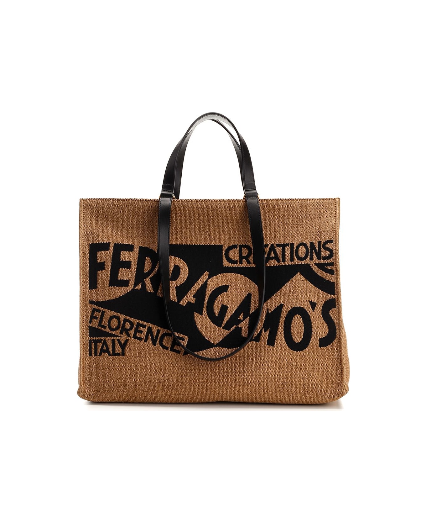 Large tote bag in woven raffia and cotton from Ferragamo, macro embroidery with Venna logo on the front, double leather handle, internal leather edges, fabric lining and zipped pocket. Composition: