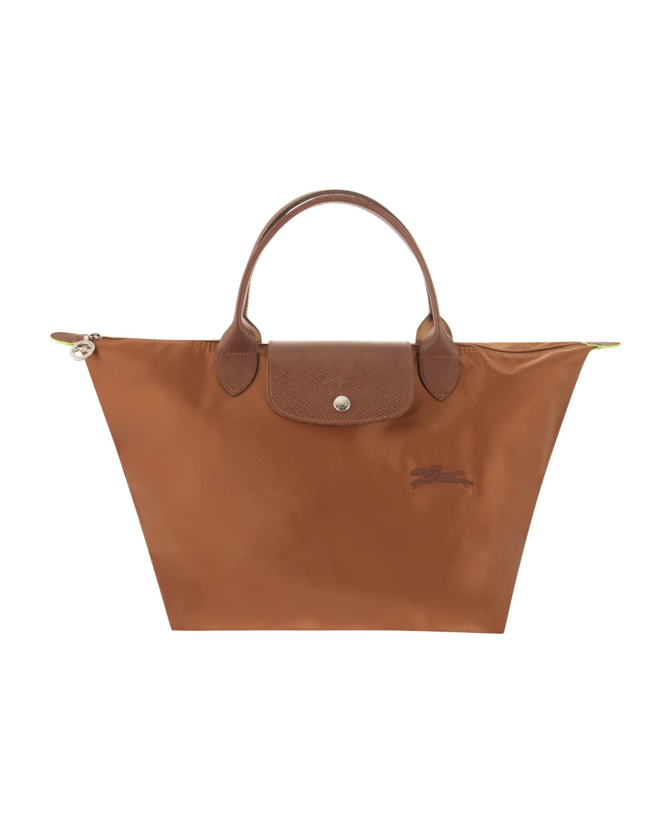 This lightweight and durable handbag can hold laptops and documents. It features clean classic lines and a feminine touch. Thanks to its two handles and press stud closure, it can be carried by hand or folded, reducing it to a pocket size in the blink of an eye. To create LE PLIAGE, a light, foldable bag that has become a cult object worldwide, Longchamp was inspired by the art of origami. The Pliage Green line has an ecological style conferred by recycled polyamide canvas. It offers a second and nobler life to the materials used. The bag adopts solid codes, such as the embroidered horse, and features tone-on-tone Russian leather trimmings, characteristic of Longchamp. The final detail: a green border on the handle, indicative of the eco-friendly use of materials, recalls the brand's characteristic bright green colour, a symbol of energy, freshness and dynamism! A socially responsible line for an everyday look that fully respects natural resources. - Inside flat pocket : 1 - Metallic insert : Silver-coloured DESIGNER ID: 1623 919 504