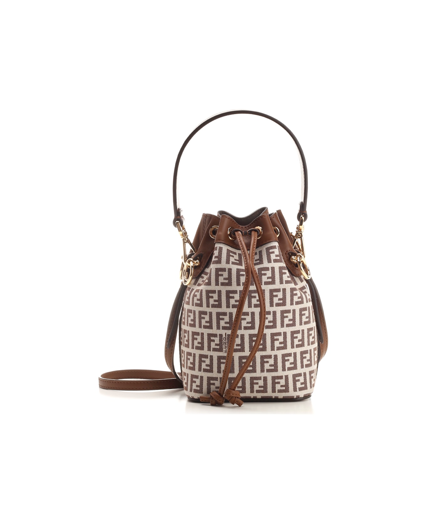 Mini 'Mon Tresor' bucket bag in cream white fabric from Fendi, with micro FF jacquard motif in shades of brown, lined interior, brown leather details, two removable shoulder straps, one long and one short, metal accessories with golden finish.