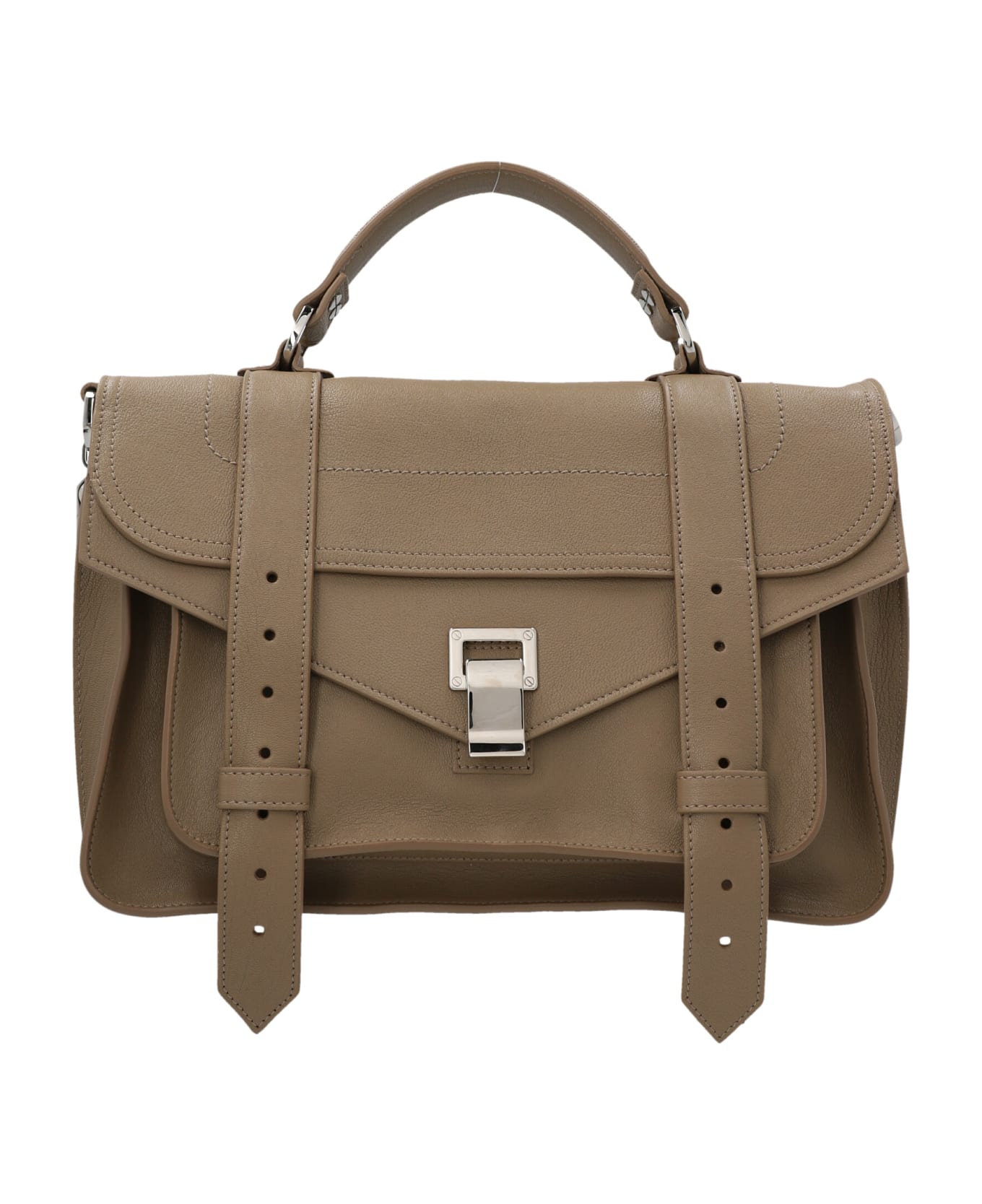 'PS1' leather handbag with a flap closure, belted straps, inner compartment with durable canvas lining, a leather-finished zip pocket, the outer part has a zip pocket with a zip compartment on the front and a zipped pocket at the back, a top handle, comes with an adjustable and removable shoulder strap, and an enameled logo tag.