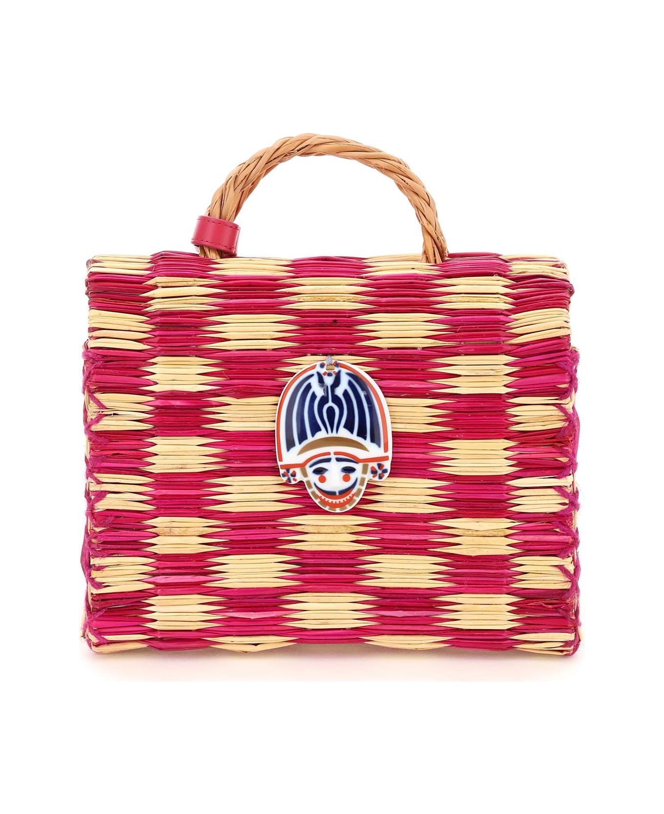 Medium Tom Tom bag by HEIMAT ATLANTICA crafted in hand-woven reed and enriched with porcelain fetish from Sargadelos applied on front. Reed top handles connected with a leather strap with press-stud, unlined interior with leather base, gold-finished metal protective feet.