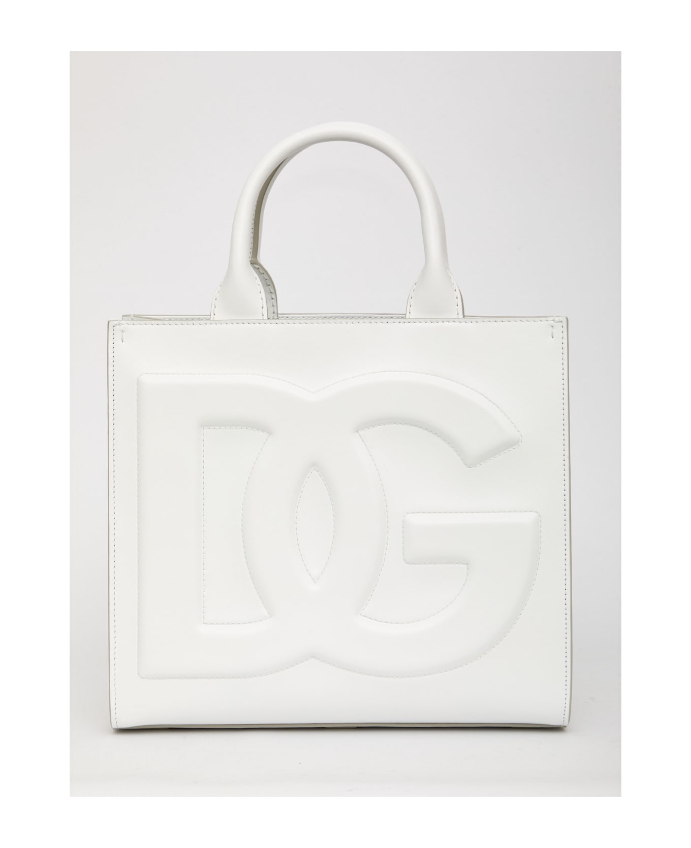 Small DG Daily bag in white calfskin with embossed DG logo on the front. It features fixed double handles, one main interior compartment, one interior zip pocket and one interior flat pocket. Dimensions: 26x30x15cm Composition: 100% Calfskin