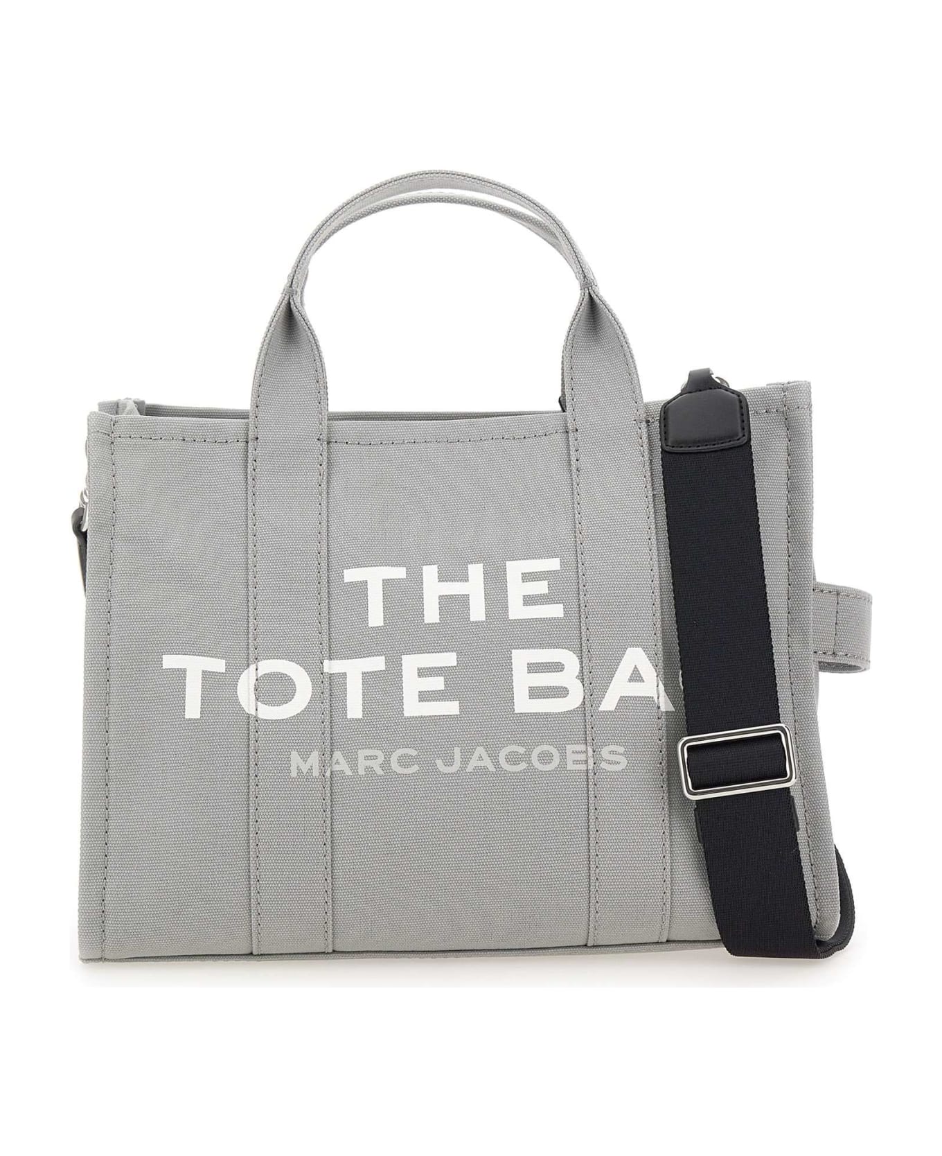 Marc Jacobs 'The Small Tote' fabric hand bag, grey, double handle,zipper fastening, removable and adjustable fabric shoulder strap, two inside pockets with zip, 2 two slip pockets, maxi front logo, back logo patch. Dimensions: height 25cm, depth 13cm, length 33cm. Shoulder strap 70cm.