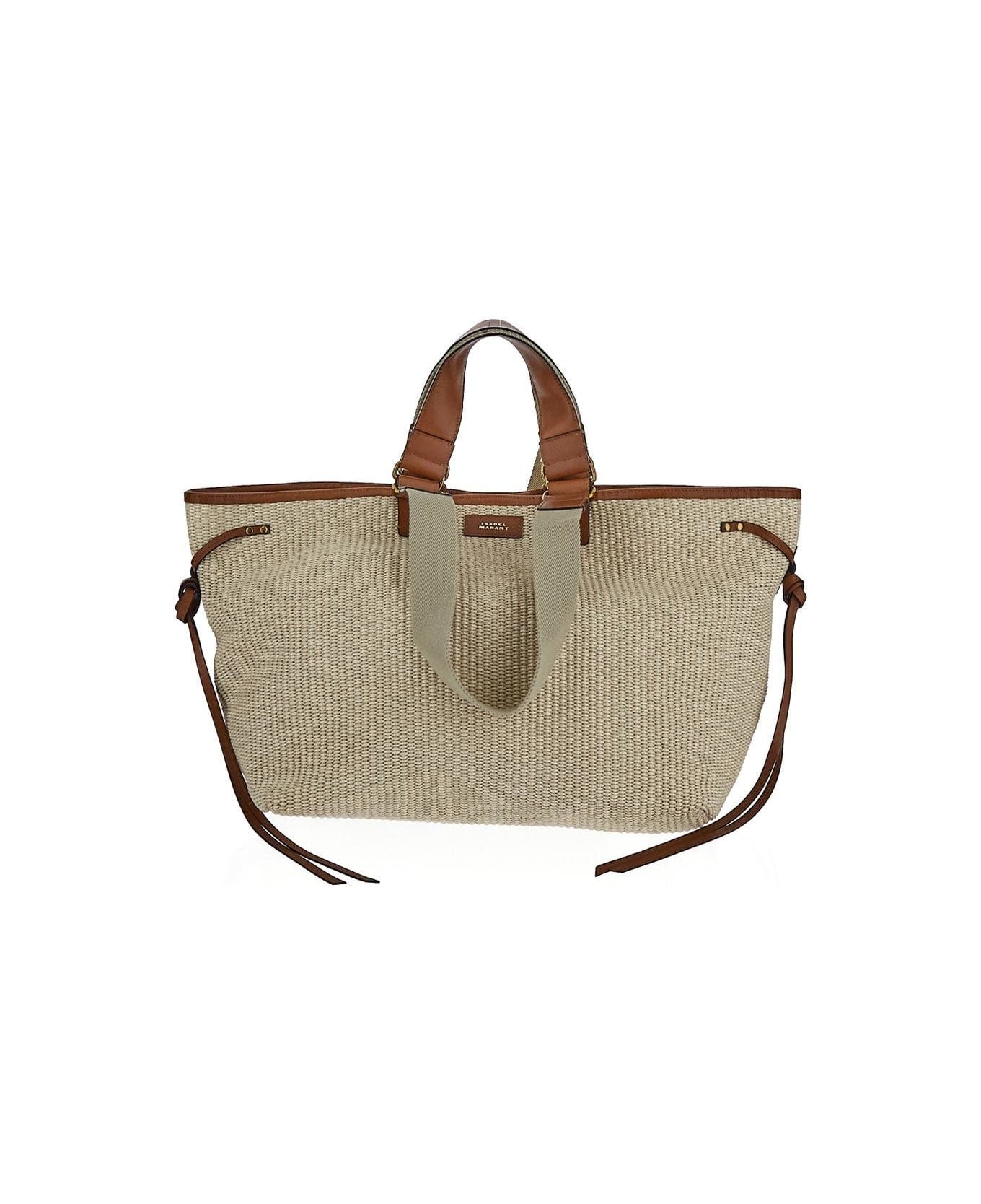 Isabel Marant tote bag in straw canvas with beige leather details, two top handles with two longer handles, magnetic closures, a main compartment, a zip pocket and gold-finish toned metal. Composition: 52% Cotton 48% Polyamide