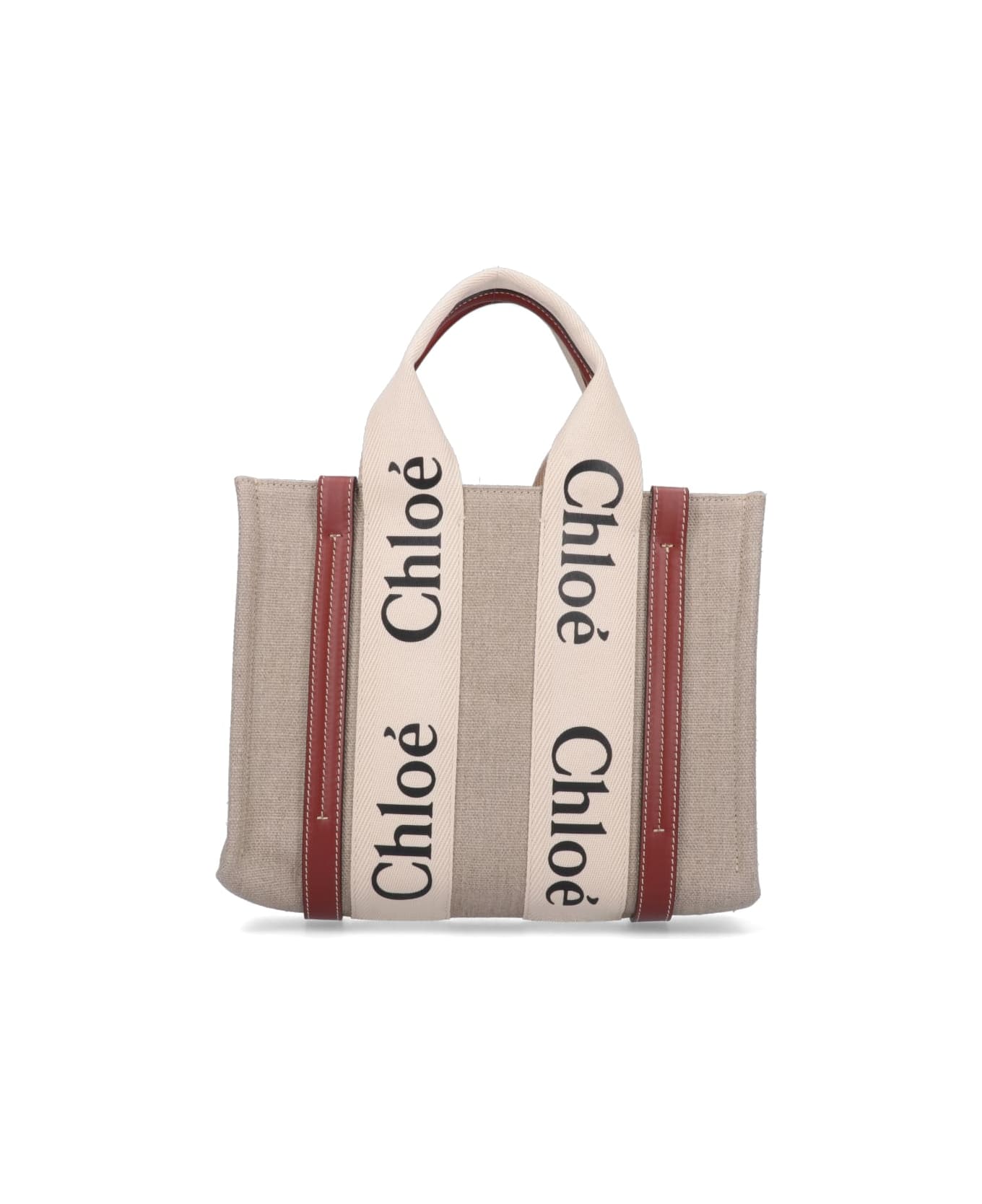 Chloe' 'Woody' Small Tote Bag, beige linen, brown leather details, cream logo top handles, one interior flat pocket, one interior main compartment. Composition: 100% Linen