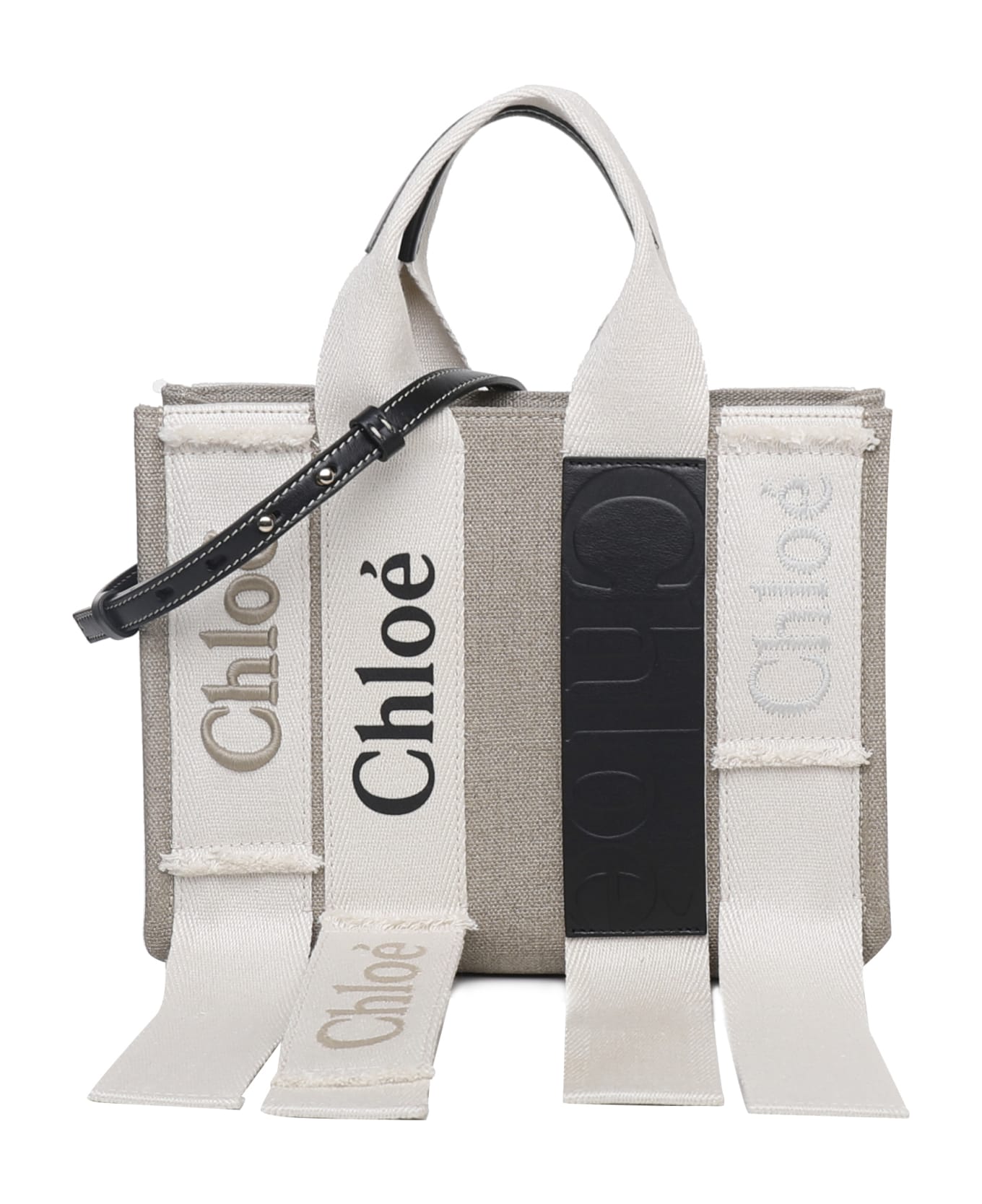 -Linen tote bag with Chloé logo embroidered ribbons