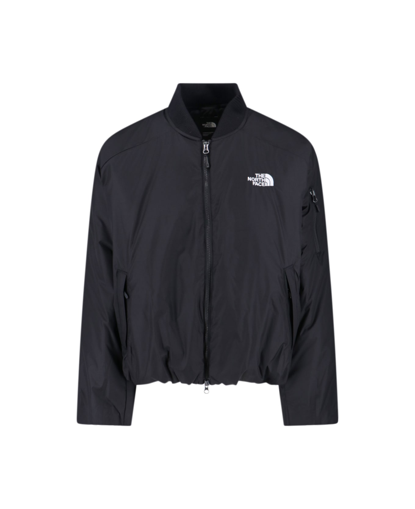 The North Face 'Choqa' bomber jacket in black fabric with shawl collar, ribbed trims, double zip closure, white logo embroidery on the chest, two side zip pockets, contrasting logo embroidery at the back, elasticated cuffs and waist, padded and quilted lining, straight hem.