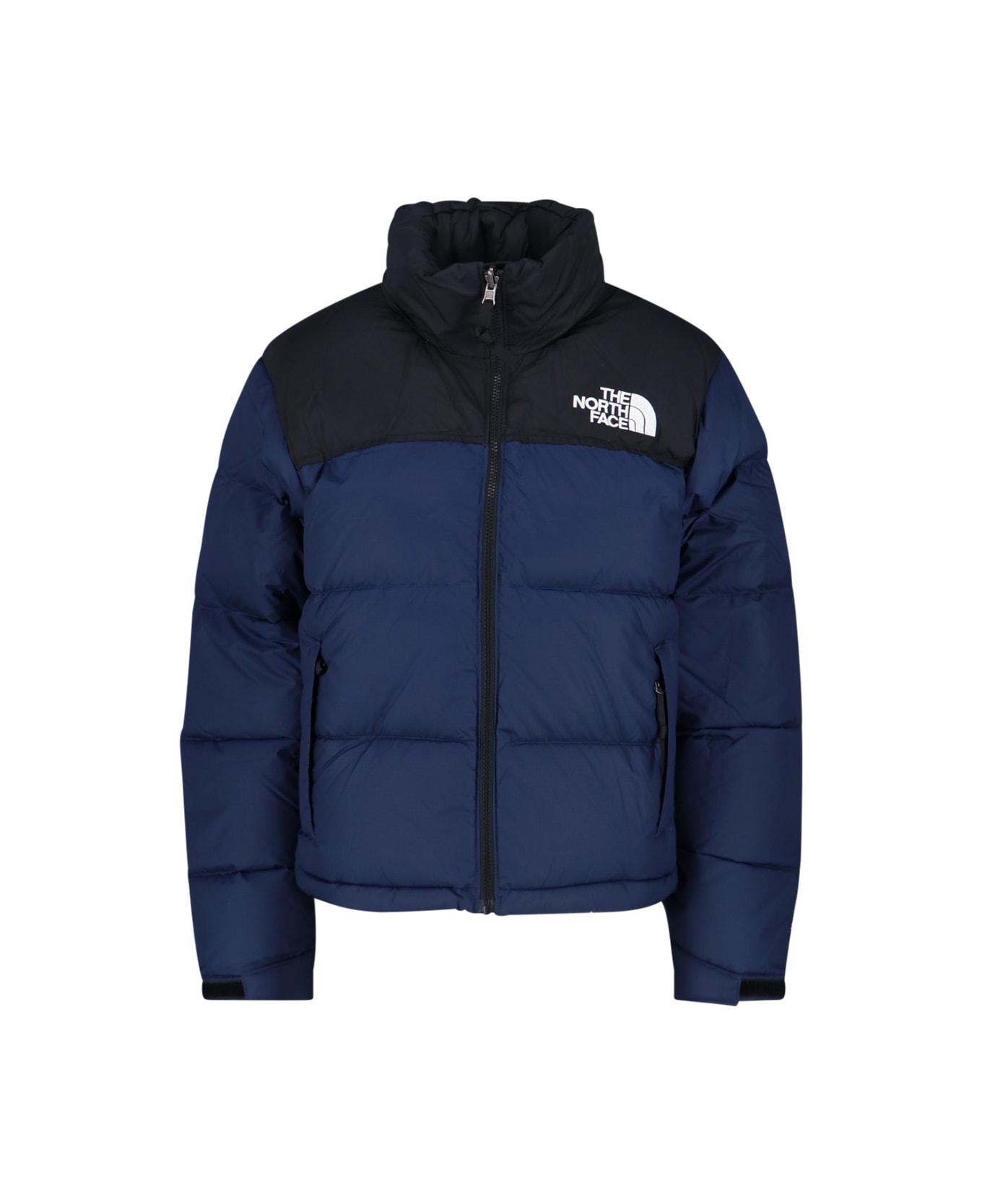 "1996 Retro Nuptse" down jacket in blue and black water-repellent fabric with padded and quilted design, hood with drawstring neck, VISLON® zip closure, contrasting logo embroidery on the chest, two side zip pockets, foldable on the side pocket, one inner zip pocket, contrasting logo embroidery on the back, embroidery detail on the cuff, adjustable cuffs, straight hem with drawstring.