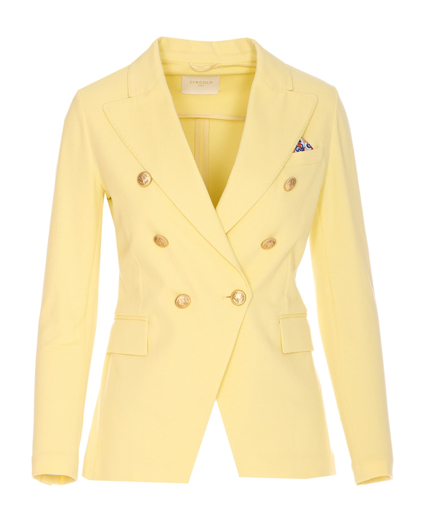 Circolo 1901 yellow double breasted jacket, frontal double breasted buttons closure, reverse detail, v-neck, long sleeves, buttons on cuffs, pockets on the front Composition: 97% Cotton, 3% Elastane