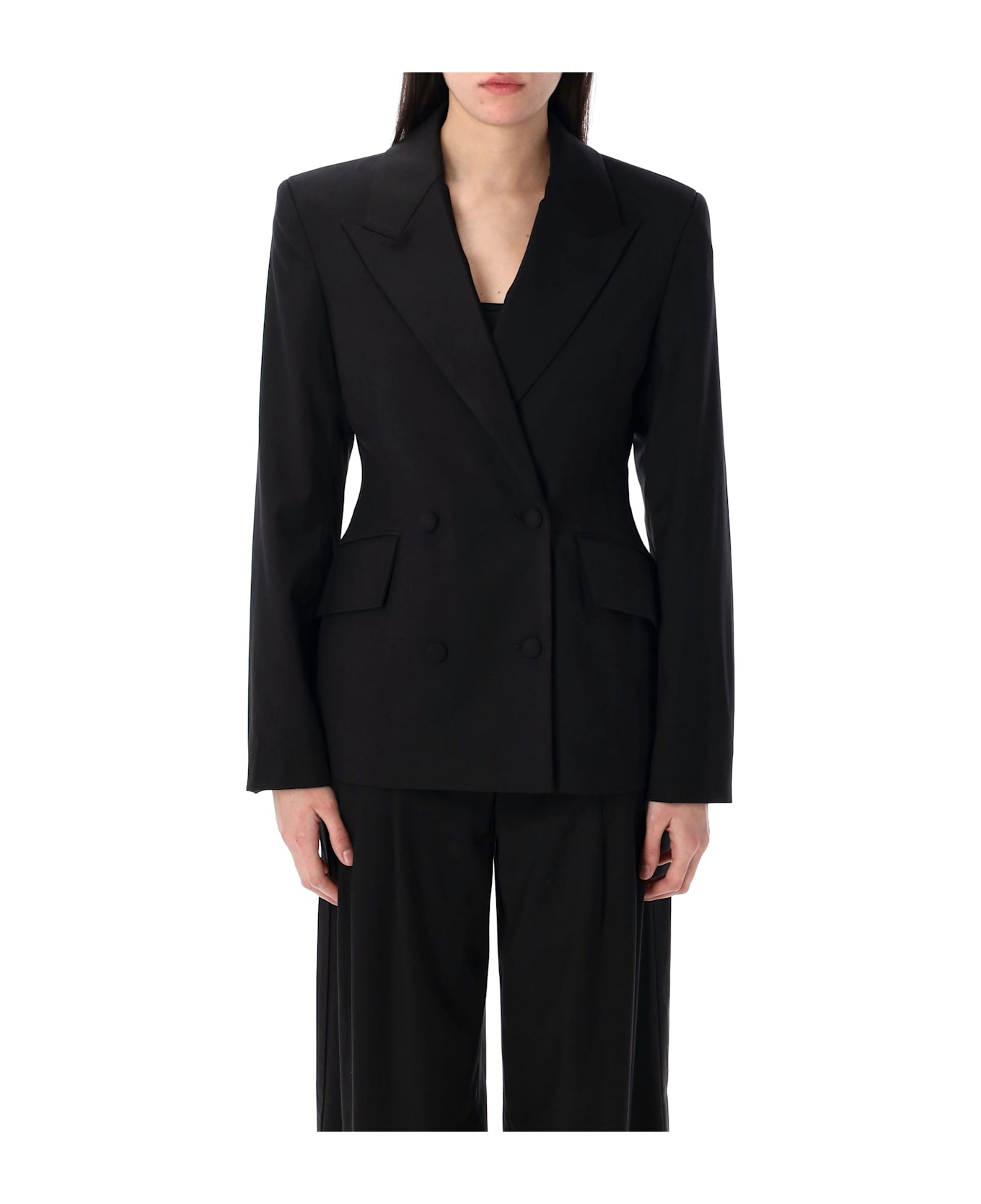 Fitted Blazer By Remain. Featuring: Notched Lapel Double-breasted Design With Covered Buttons Tailored Waist Front Flap Pockets Model Is 1,70 M And Wears Size 36