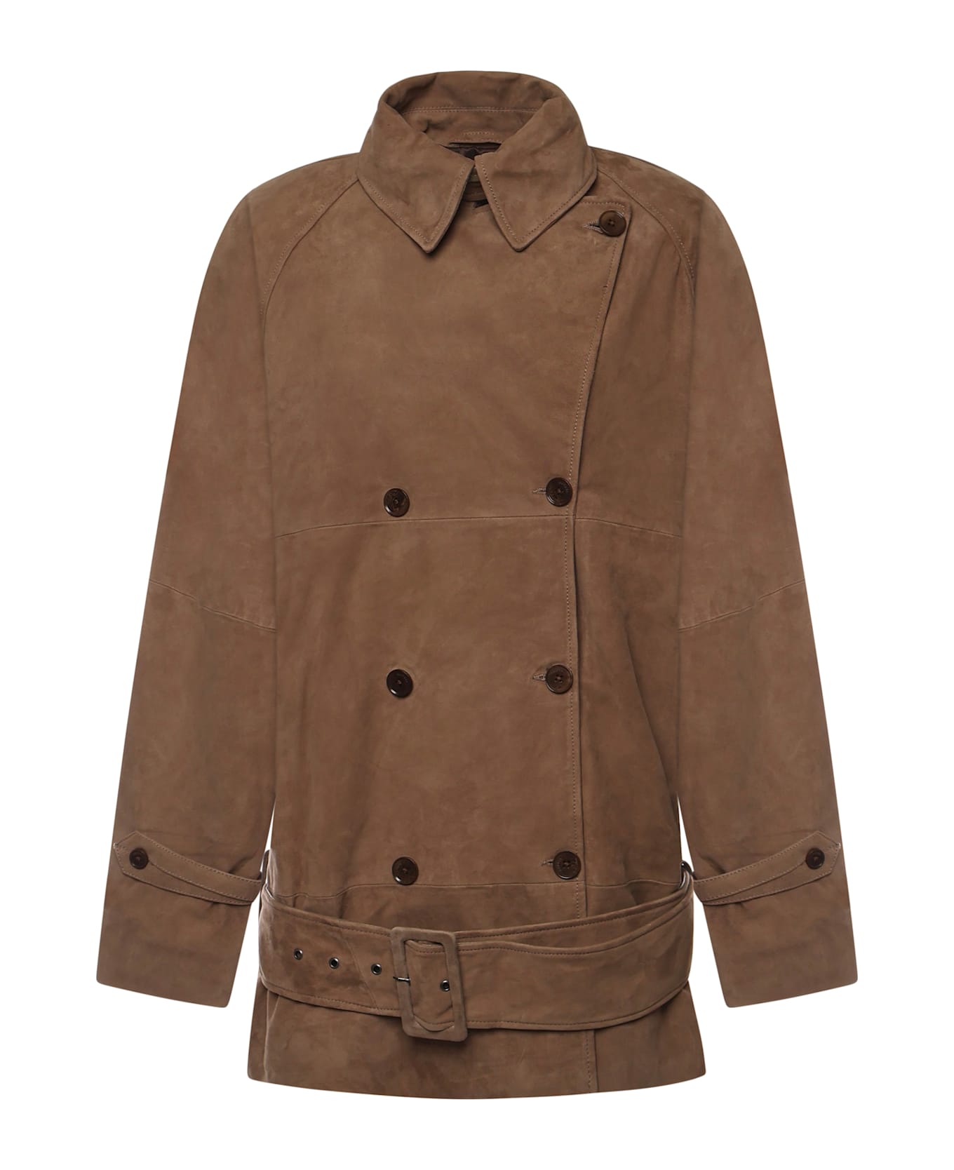 - Made of suede - Double-breasted button closure - Waist with matching belt - Lining - Size shown is 32 - Designer color: Morel